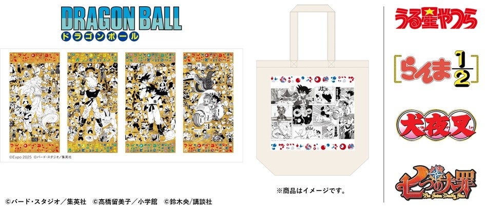 「マンガの世界」を商品コンセプトとして、世界的人気作品『DRAGON BALL』をはじめとした5作品とコラボレーション。コラボレーショングッズは、日本古来の屏風絵から着想を得て、万博のデザインシステムと融合したデザインとなります。魅力的な「マンガの世界」を、コラボレーショングッズを通じてお届けします。さらに、5作品のコンセプトビジュアルはDNPの文化財複製「伝匠美®」*の技術により、屏風絵としてストア内に特別展示します。コラボレーションするマンガ作品は、『DRAGON BALL』(鳥山明/著)、『うる星やつら』『らんま1/2』『犬夜叉』(高橋留美子/著)、『七つの大罪』(鈴木央/著)、世界中のファンが熱狂する大人気5作品をラインナップ。作中の名シーンを集めた両面プリントのデザインTシャツや、作中のストーリーを屏風絵のように一枚絵にした特殊加工印刷ポスターなど、会場内でしか購入できないオリジナル商品を予定しています。