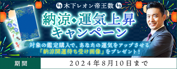 本キャンペーンでは日頃「木下レオン◆帝王数」をご利用されている皆様に感謝の気持ちを込め、人気の鑑定をお届けします。またキャンペーン対象の鑑定をご購入された方にもれなく、人生・仕事・金運・結婚・出会い・恋愛など…気になるカテゴリの中から、この夏のあなたに好調な運気を呼び込む「納涼開運待ち受け画像」をプレゼント!