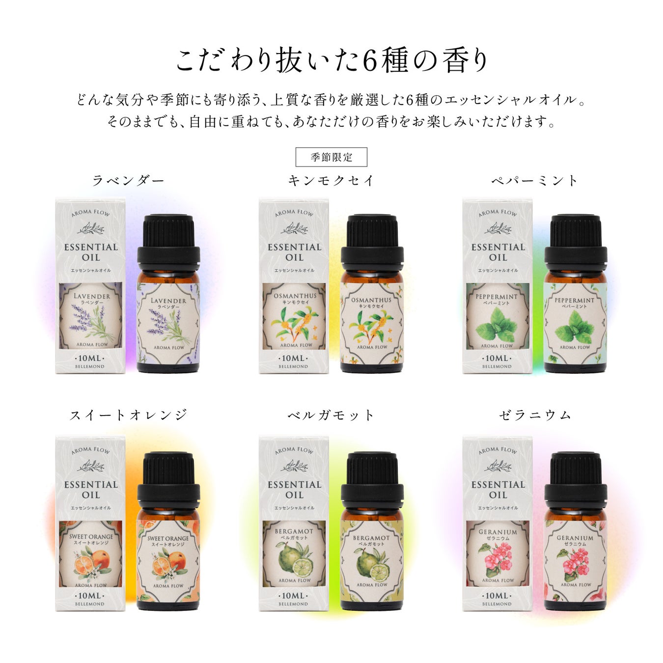 天然由来100%のエッセンシャルオイル(精油)6種を発売開始。金木犀(季節限定)・ラベンダー・ゼラニウム・スイートオレンジ・ベルガモット・ペパーミント。厳選素材で本物のやさしい香り立ち&リラックス。