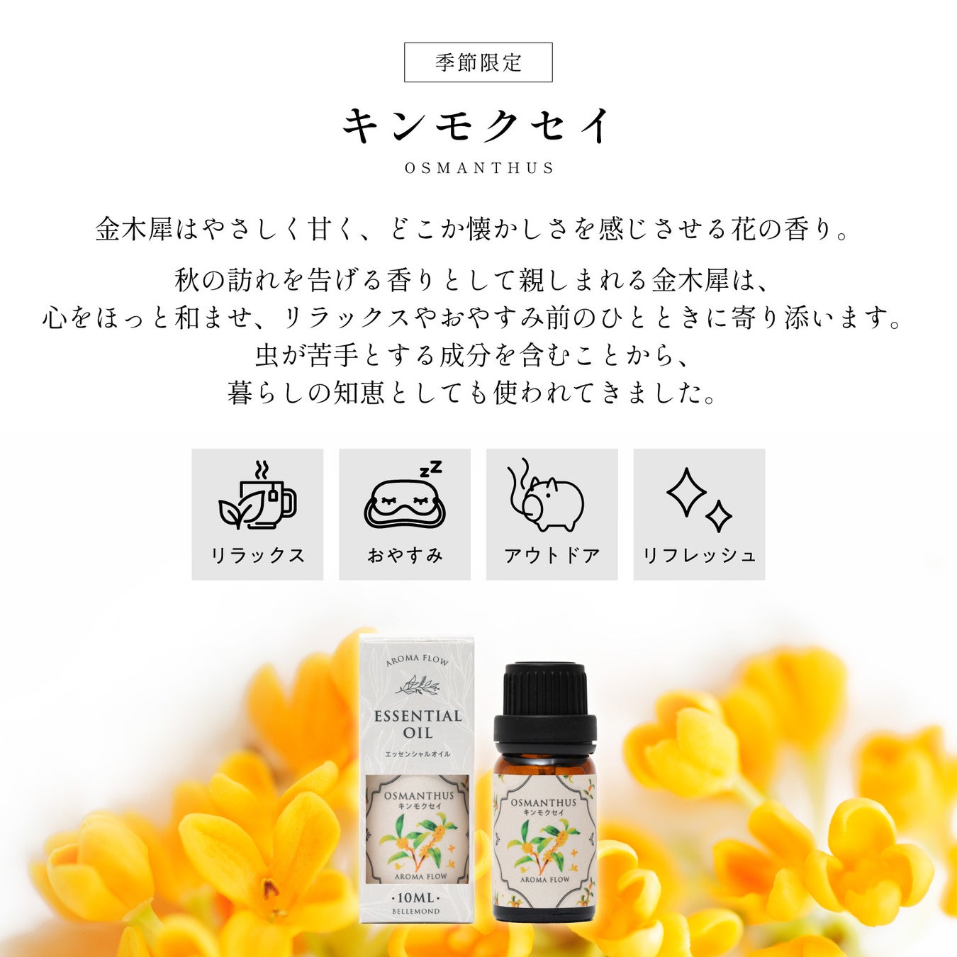 天然100%のアロマオイル、Amazonにて販売開始。リーズナブルな価格で、本物の香りが楽しめる。キンモクセイを含む6種類の精油が登場。合成香料不使用の10ml。AROMA FLOW(アロマ フロー)
