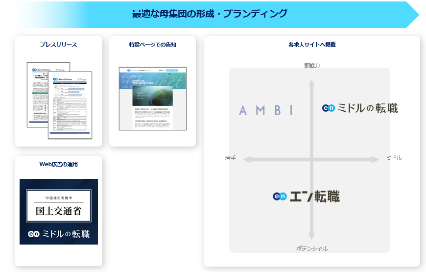 プレスリリースや特設ページ、Web広告での告知に加え、各求人サイトでの集客支援を実施。『エン転職』『AMBI』『ミドルの転職』とターゲットの異なる求人サイトを活用することで、ターゲットへ網羅的に求人を届けます。
