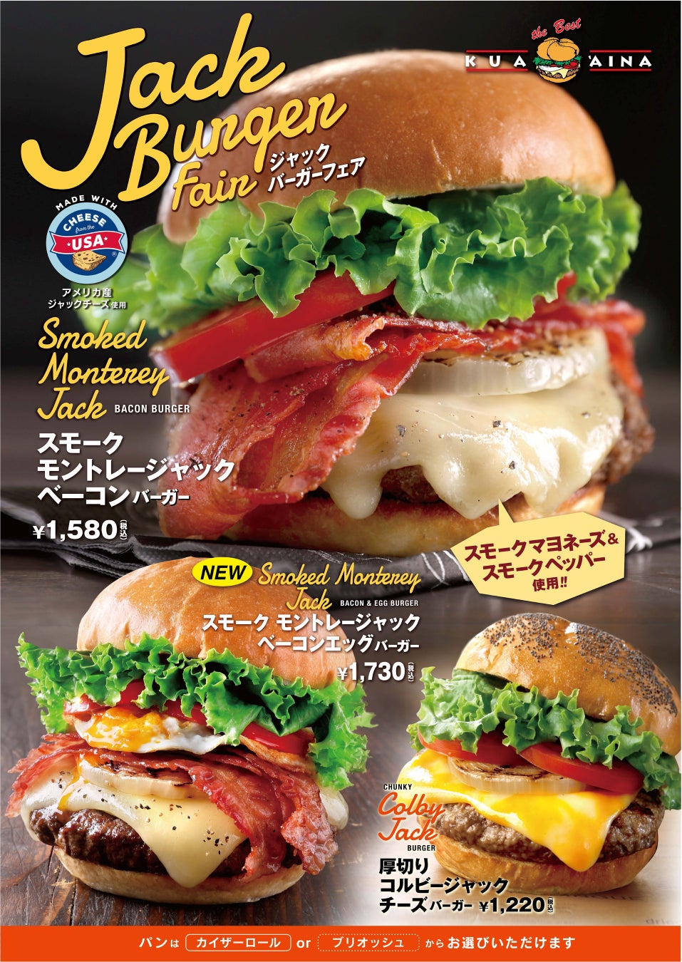 クア・アイナからチーズ好きにはたまらない「ジャックバーガーフェア」を今年も開催 燻製づくしの『スモーク モントレージャック ベーコンバーガー』にフライドエッグが加わりパワーアップした新メニューが登場!