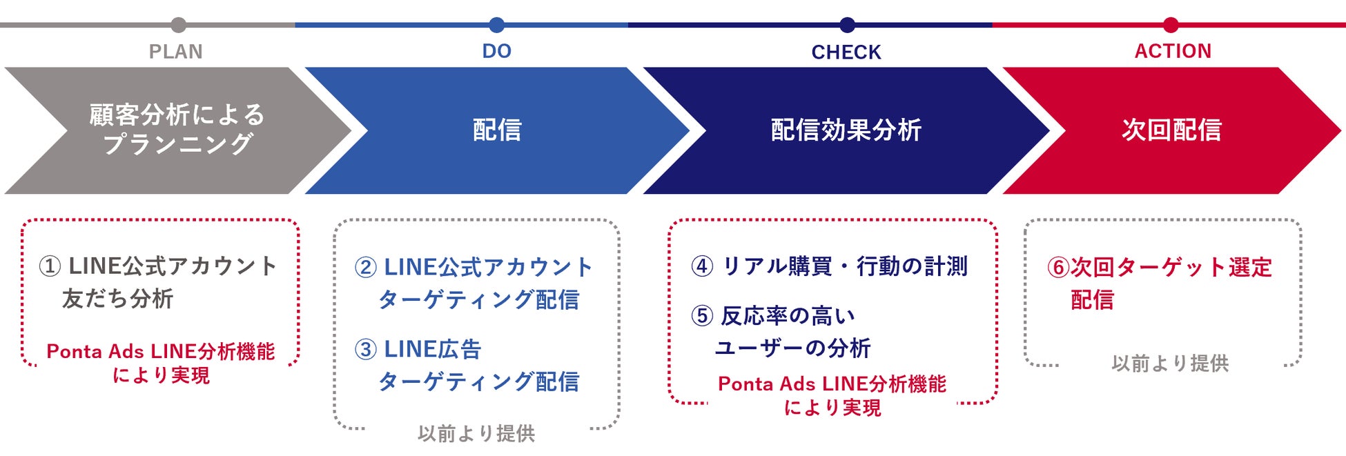Ponta Adsでは、LINEのプラットフォーム上で、Pontaデータを活用したメッセージ配信・広告配信が可能です。今回、分析機能を追加したことで、ターゲティング・分析それぞれ単体での取り組みはもちろん、LINEのプラットフォーム上でのユーザー像を捉えたプランニングから配信・分析まで一気通貫したマーケティング支援策を提供することが可能となりました。