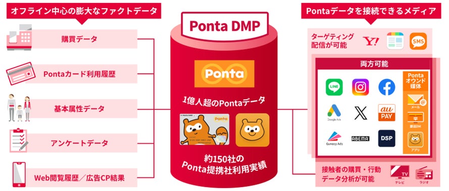 共通ポイントサービス「Ponta」の1億1,911万人(2024年9月末時点)の会員基盤をベースに、オフライン中心の膨大なファクトデータを活用して企業のマーケティングを支援するサービス。LINE・Facebook・Instagram・YouTube 広告・Google ディスプレイ ネットワーク・X(旧Twitter)などへのターゲティング広告配信から、広告接触者のうち実際に店舗での購買に至った人数や購入金額などを算出するリアル購買分析まで、マーケティングのPDCAを回せる仕組みを提供しています。