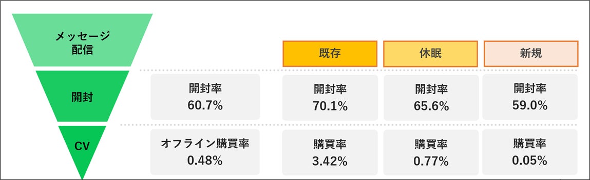 PontaのLINE公式アカウントで実施したプロモーション効果について、Ponta Ads LINE分析機能を用いて分析しました。リアル購買データを基に、メッセージ配信対象となる友だちを「既存顧客」「休眠顧客」「新規顧客(店舗周辺在住者)」の3つにセグメントし、家電量販店Aでのポイントキャンペーン訴求のメッセージを配信しました。その後、実際の店舗での購買率を確認し、セグメントごとにメッセージ配信効果を検証した結果、購買率は既存、休眠、新規の順に高い傾向となり、既存以外の顧客にも一定の効果が見られることが分かりました。