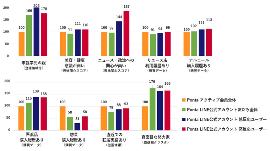 Ponta LINE公式アカウントの友だちを、過去数カ月のメッセージ開封数に応じて高反応ユーザー、低反応ユーザーに分類し、それぞれの属性やライフスタイル、購買傾向などを分析しました。さらに、Pontaアクティブ会員全体の各セグメントにおける比率を100として比較することで、高反応ユーザー、低反応ユーザーの特徴を可視化しました。