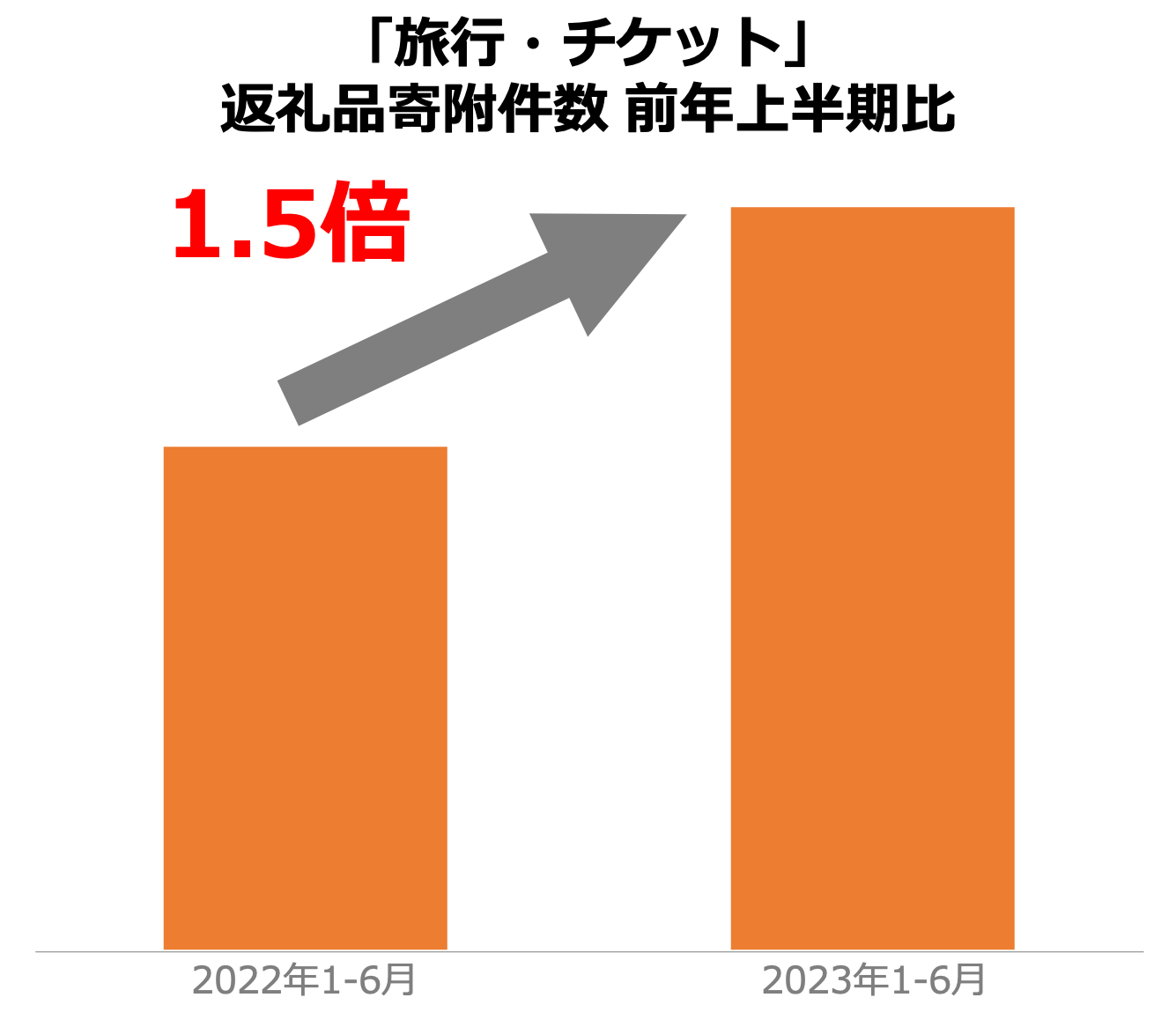 - 旅行体験型返礼品「ふるなびトラベル」や飲食体験型返礼品「お店でふるなび美食体験」などを含むカテゴリー「旅行・チケット」の寄附件数は、前年上半期の1.5倍に。