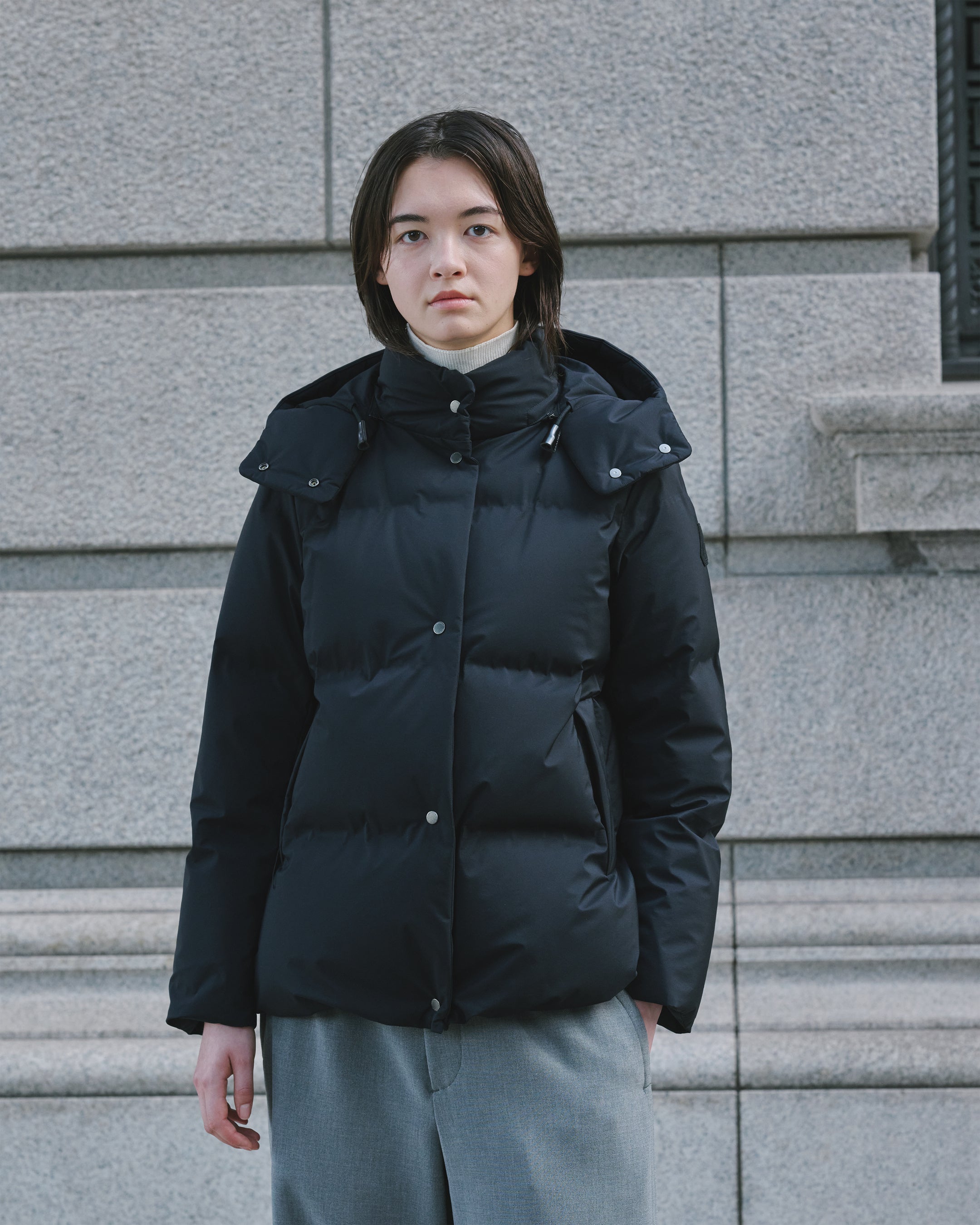 青森ファクトリーのクラフツマンシップが息づくショート丈。リサイクルナイロンを高密度に織り上げた三層構造素材は、透湿防水性に優れ、特殊染色により深みのある漆黒カラーを実現しました。青森で育まれた上質なダウンを惜しみなく充填し、縫い目を感じさせないシームレス仕立てで、雨風をしっかり防御。比翼仕立てのフロントはすっきりとミニマルに、高級感のあるエクセラファスナーや立体的なフードも装備。丁寧な縫製に裏打ちされたクオリティの高さで、都会に映える本格派ダウンが完成しました。