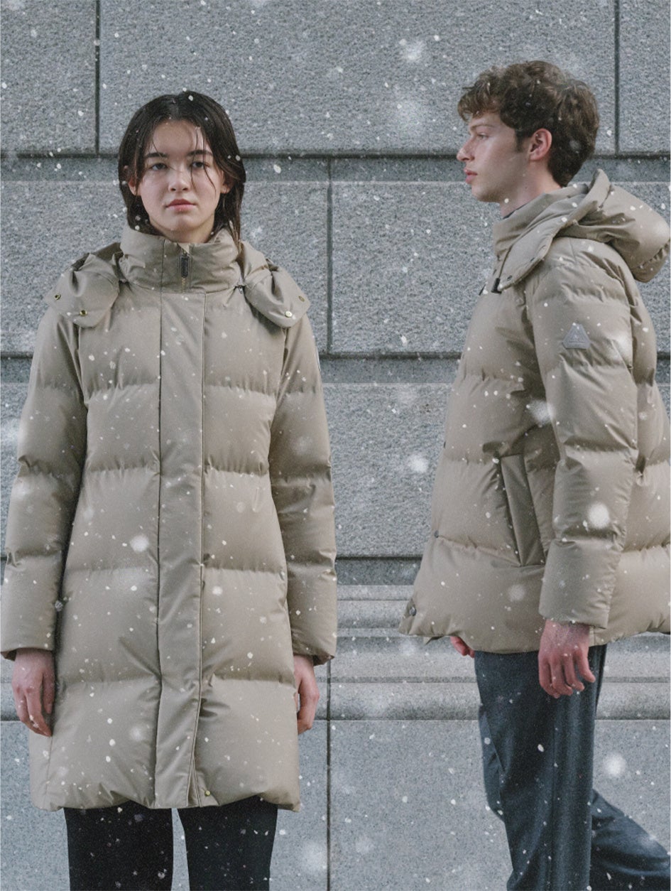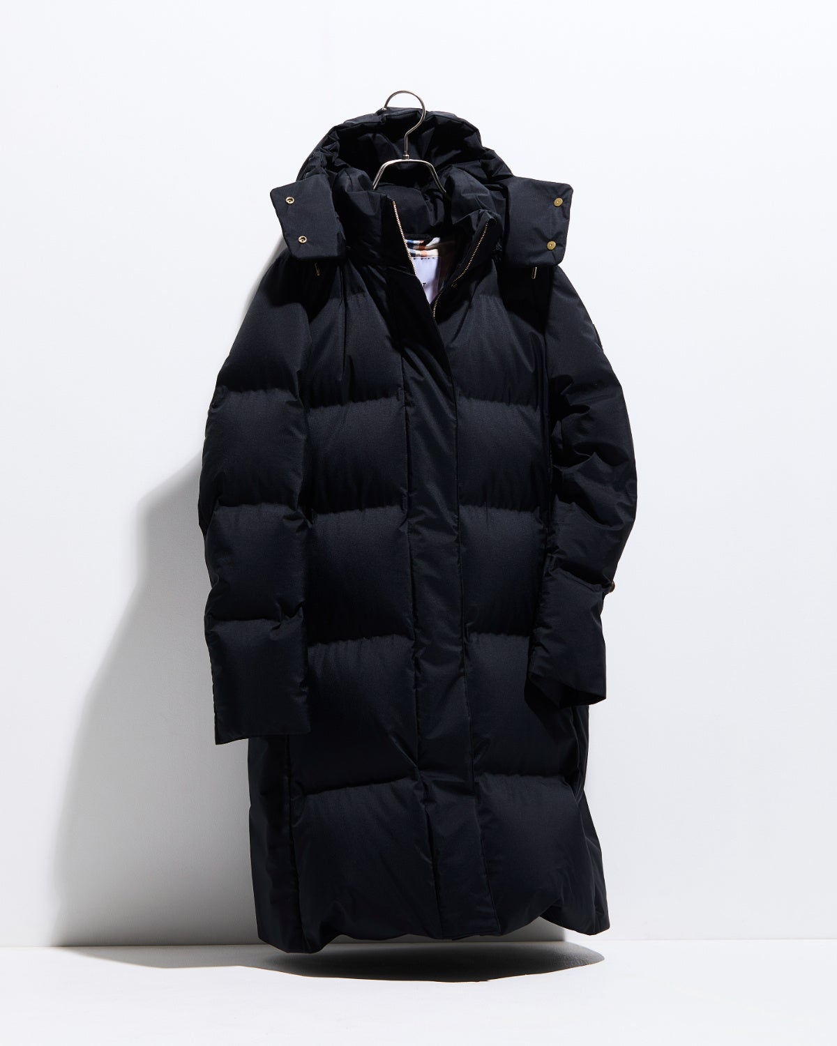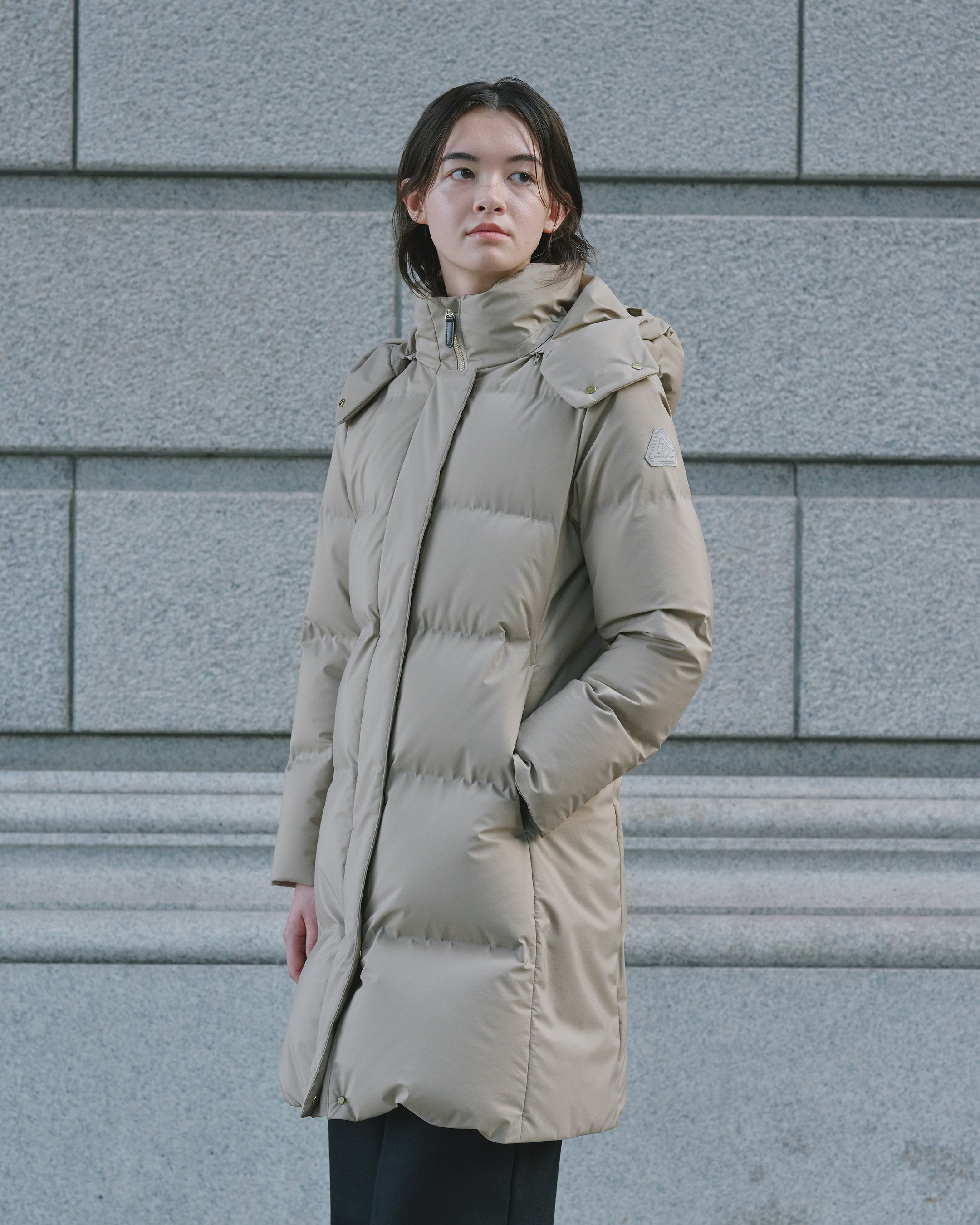 冬の装いにアクティブさと気品を添えるロングダウン。リサイクルナイロンを高密度に織り上げた三層構造素材は、透湿防水性に優れ、軽やかさと上質さを両立しています。青森産の高級羽毛を贅沢に充填し、シームレスな仕立てがロング丈ならではの端麗なラインを造形。ダウンでありながらスポーティ一辺倒に偏らず、比翼仕立てのフロントや着脱可能なフードやエクセラファスナーが、品格ある佇まいを演出します。大人の冬にふさわしいエレガンスと、確かな機能性を備えた一着です。