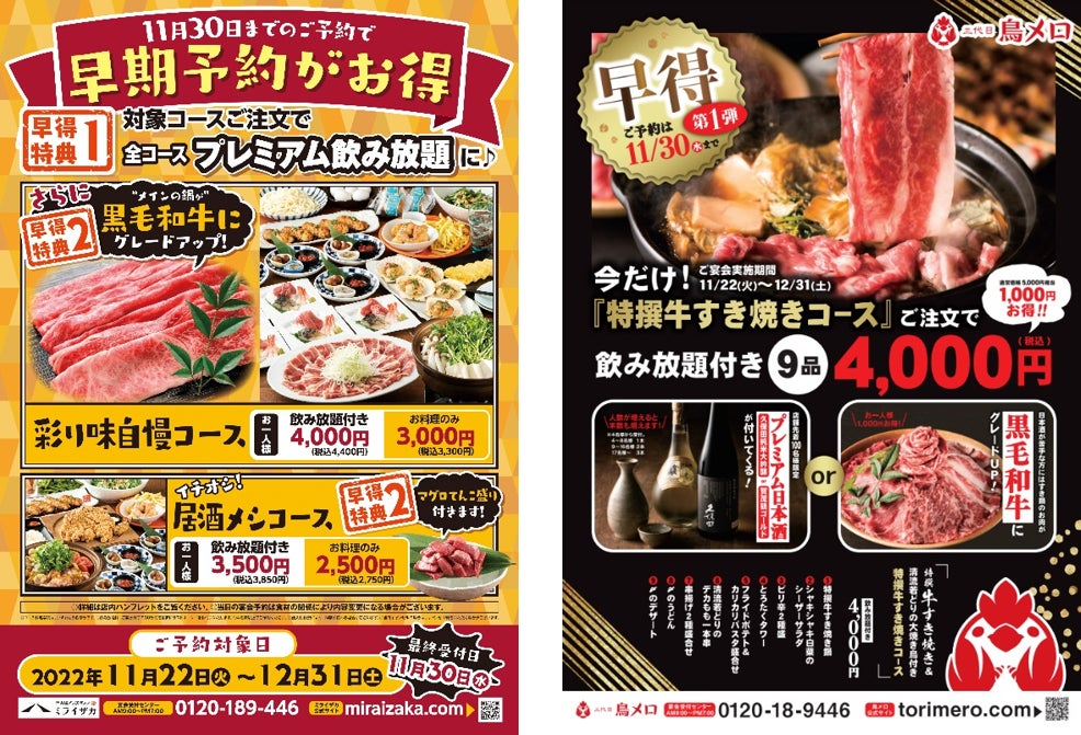 今回は、3年ぶりに行動制限のない忘年会シーズンを迎えるにあたり、弊社の居酒屋主力事業である「ミライザカ」「三代目 鳥メロ」の2022年10月末の予約状況と傾向、さらに今後の取り組みについてお知らせいたします。