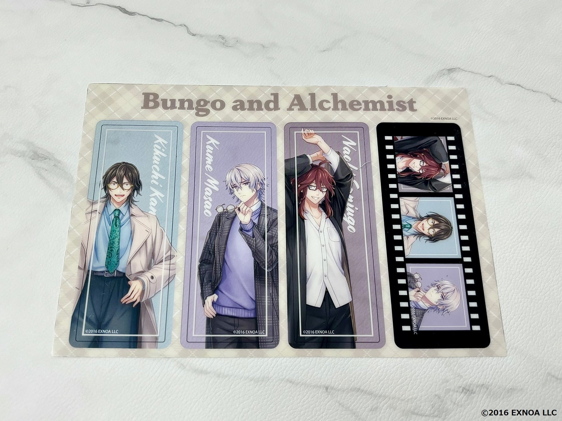 メガネをかけた久米正雄たちの等身描き下ろしイラストを使って、内容盛りだくさんで登場した『文豪とアルケミスト』の新作グッズ。