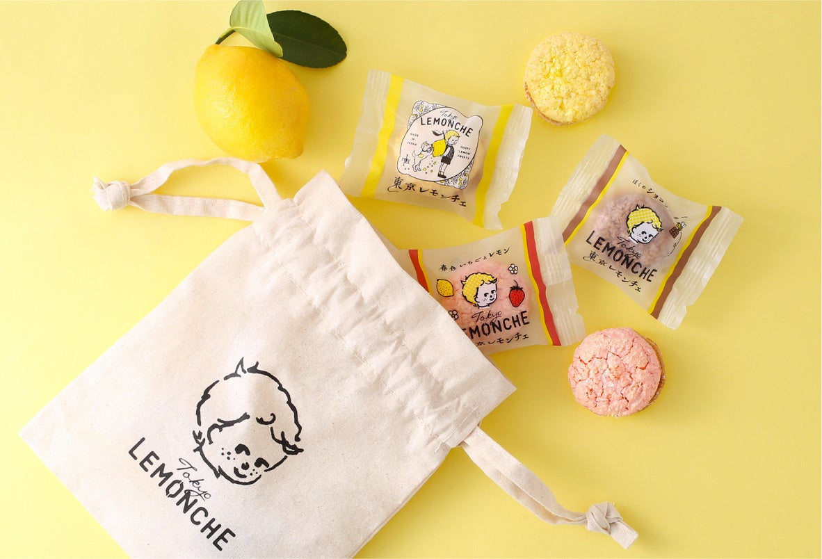 レモン坊やの可愛いイラストが入った巾着に3種のレモンチェを詰め合わせた〈東京レモンチェ~ぼくの巾着アソート~〉。人気の定番『東京レモンチェ~ふわふわレモンクリームサンド~』、苺とレモンの甘酸っぱいハーモニー『春色いちごとレモン』、はちみつが香るショコラをプラスした『ぼくのショコラハニー』の3つのおいしさを一度でお楽しみいただけます。プレゼントにもおすすめです。
