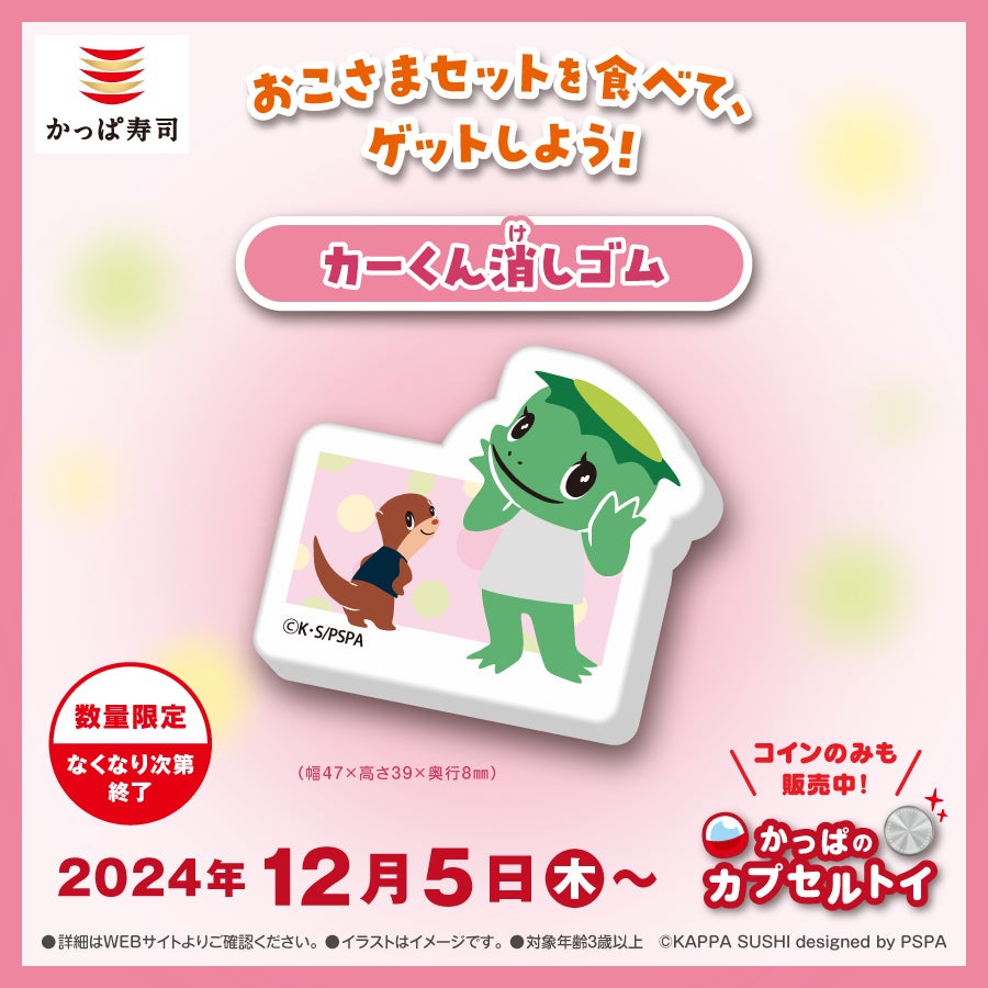 コロワイドグループのかっぱ寿司(カッパ・クリエイト㈱ 本社:神奈川県横浜市、代表取締役社長 山角豪)は、2024年12月5日(木)より、かっぱ寿司店内に設置している「かっぱのカプセルトイ」に、かっぱ寿司の看板キャラクターカーくんとカワウソくんの限定アイテム全3種が登場します。