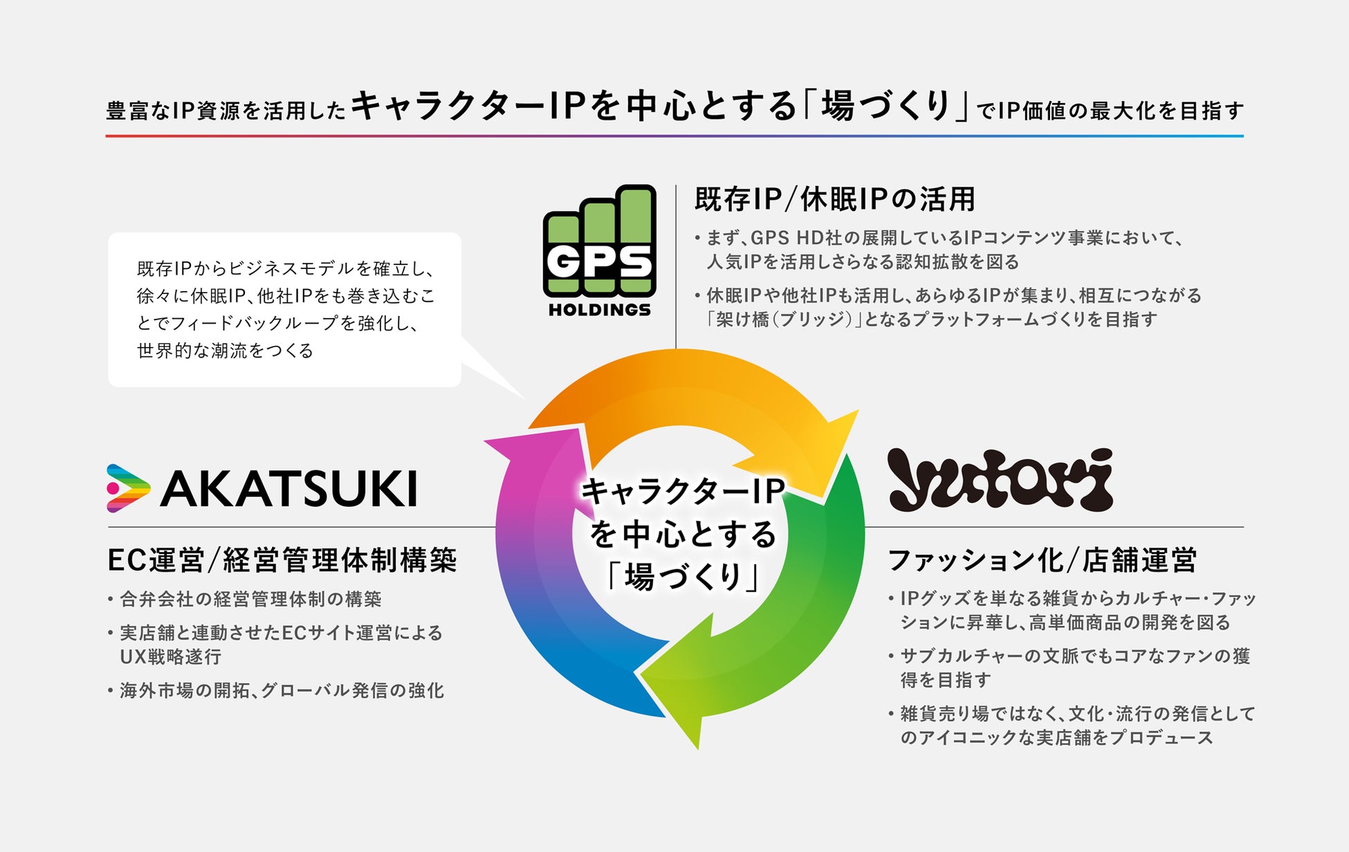 当社グループのデジタルコンテンツ・オンラインサービス開発力、yutoriグループの若年層向けファッション・店舗運営ノウハウ、GPS HDのキャラクターグッズ企画・製造・公式EC運営の実績を組み合わせることで、単なるキャラクターグッズ・雑貨にとどまらない、「ファッション」「カルチャー」「デジタル体験」等を横断したライフスタイル提案型のIPプラットフォームを構築し、日本発IPの価値最大化を図ります。