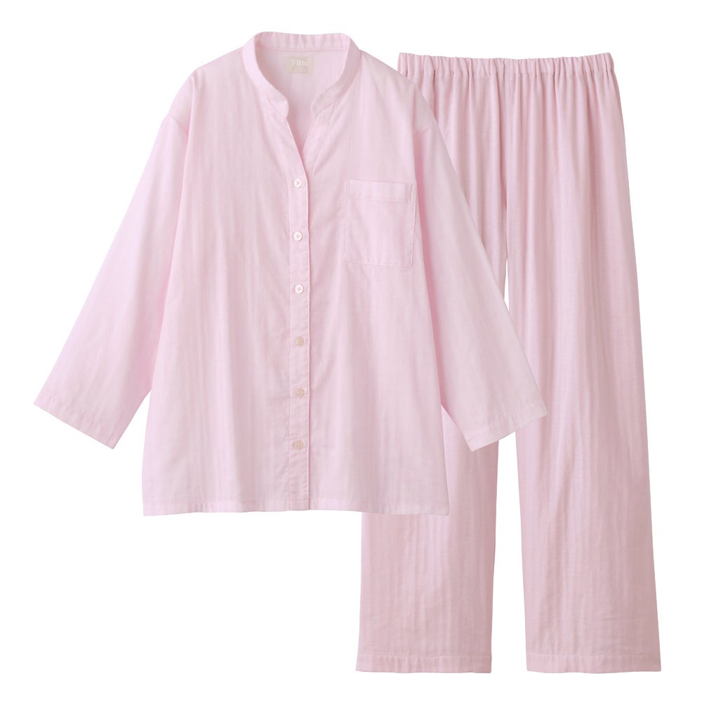 ダブルガーゼ 長袖長パンツパジャマ(ノーカラー)