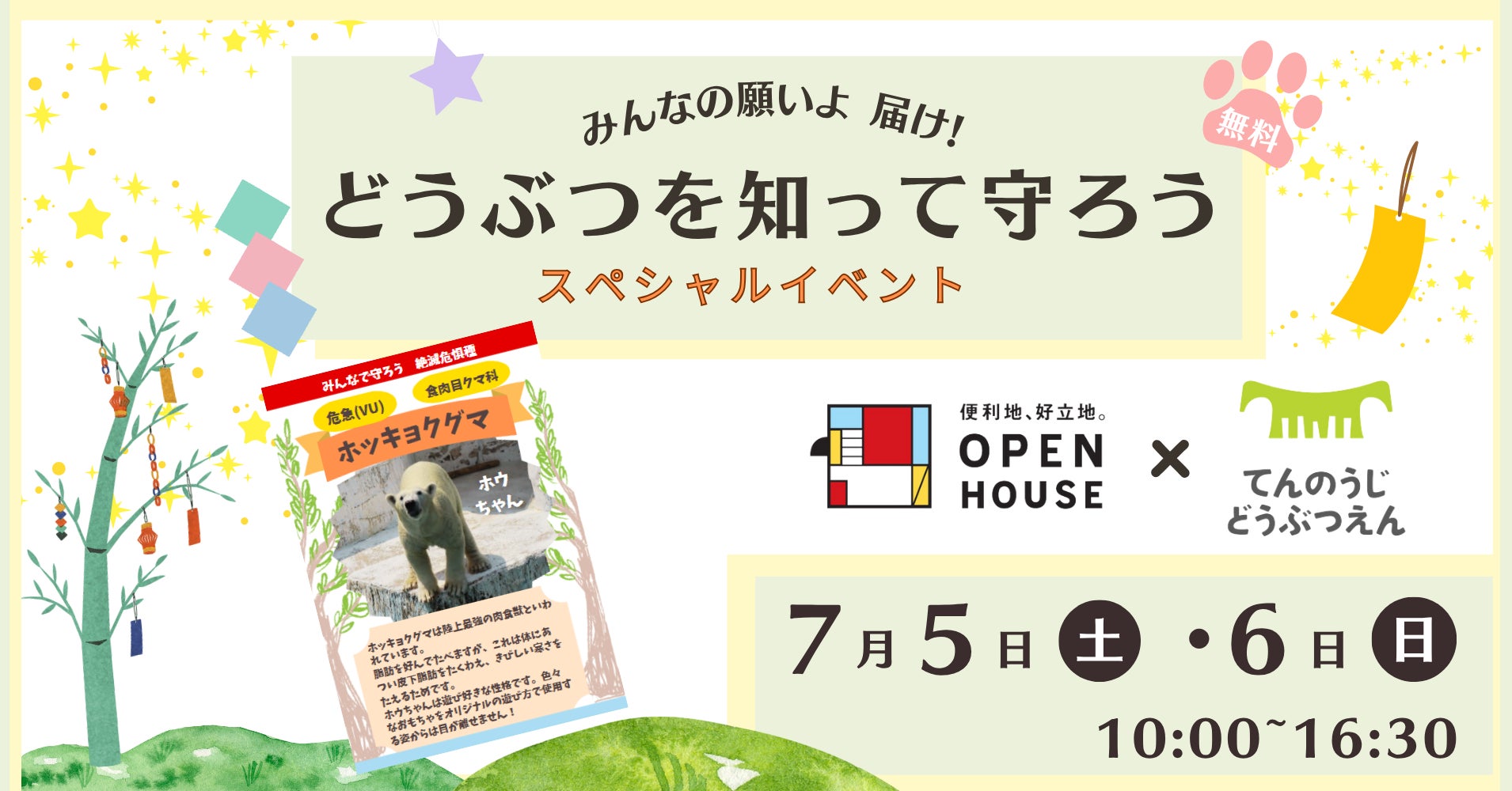 株式会社オープンハウスグループ(本社 東京都千代田区、代表取締役社長 荒井正昭)のグループ会社である株式会社オープンハウスの関西支社は、天王寺動物園と、絶滅危惧種を学ぶ子ども向けイベント「みんなの願いよ 届け!どうぶつを知って守ろう スペシャルイベント」を開催いたします。