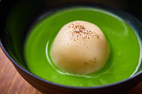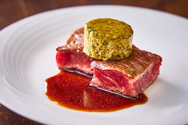 ランチタイムは鉄板で焼き上げ芳ばしい香りが食欲をそそる黒毛和牛にハーブや香辛料を混ぜ合わせたオリジナルの合わせバターを添えてご提供します。ディナータイムからは目にも美しいうぐいす色の庵かけが色鮮やかな逸品。百合根のホクホクとした食感とともにお楽しみください。