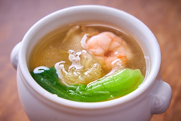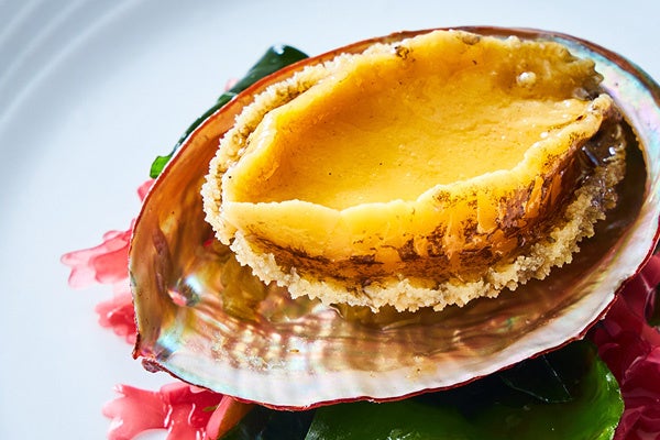 ランチタイムからは魚介とふかひれの旨みとコクがあふれるスープをお届けいたします。ふかひれの食感を楽しみながらお召し上がりください。ディナータイムは蝦夷鮑を豪華に使用し、香りづけのノイリー酒で蒸し焼きに仕上げました。やわらかな食感をお楽しみください。