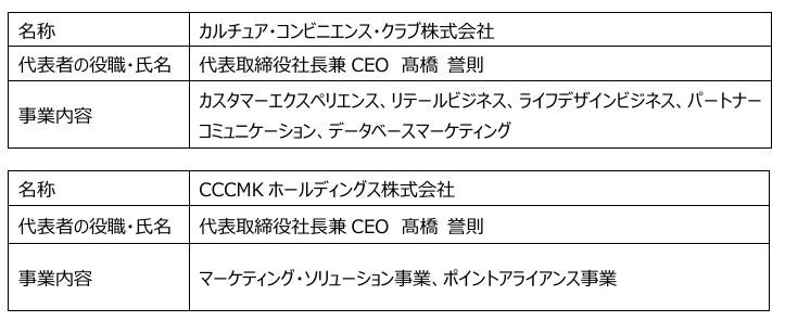 また、CCCMKHDの商号は「Vポイントマーケティング株式会社」(以下「CCCMKHD(新社名:Vポイントマーケティング)」)へ、代表者は「広田 精吾(現CCCMKHD 代表取締役副社長)」へ、変更する予定です。