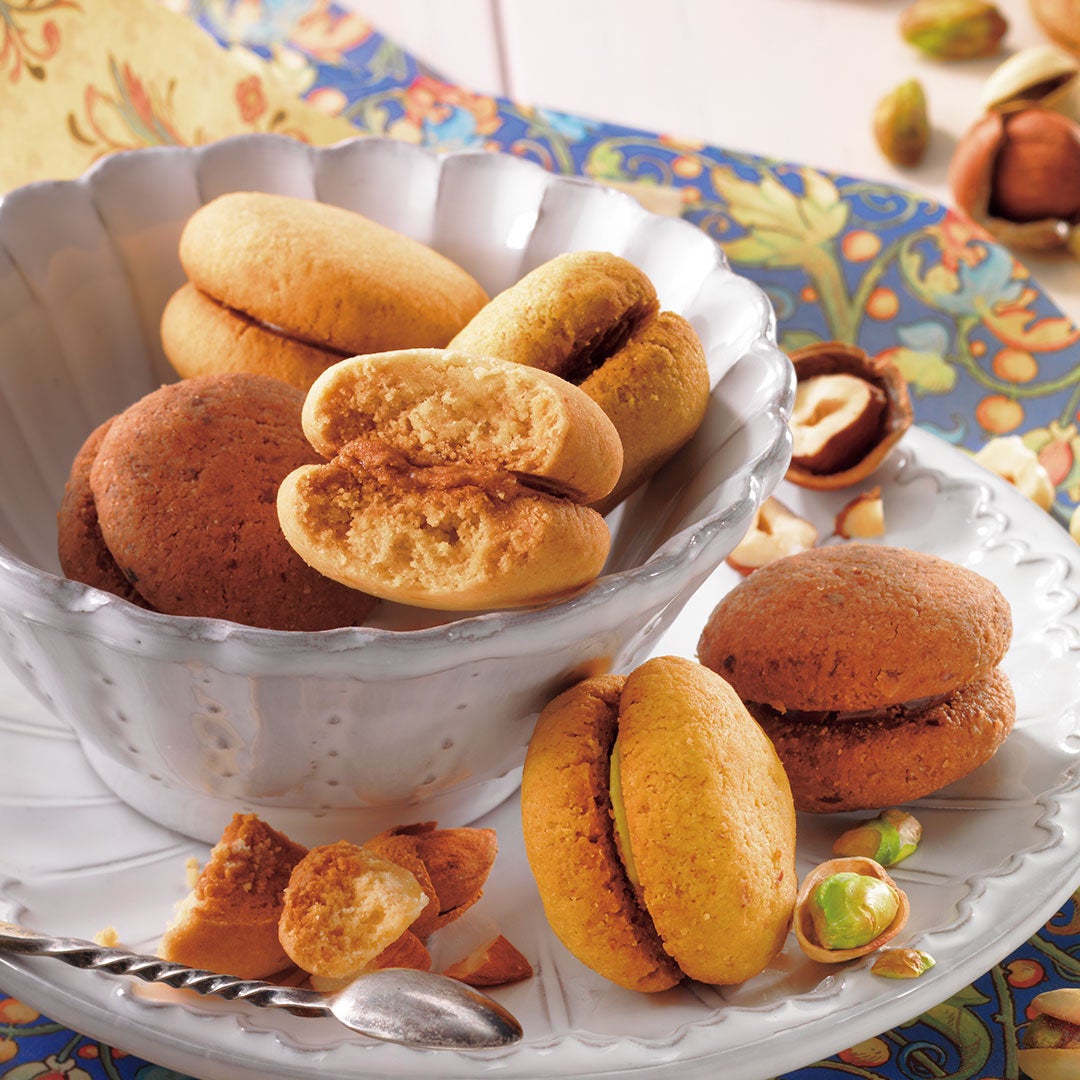 イタリア北西部・ピエモンテ州の伝統的な焼き菓子「バーチ・ディ・ダーマ」をロイズのレシピでアレンジ。 しっとりほろほろとした食感の小粒のクッキーに、味わい豊かなナッツのペーストを入れたリッチなチョコレートクリームをサンドしました。[アーモンド][ピスタチオ][ヘーゼル]の3種類の詰め合わせです。