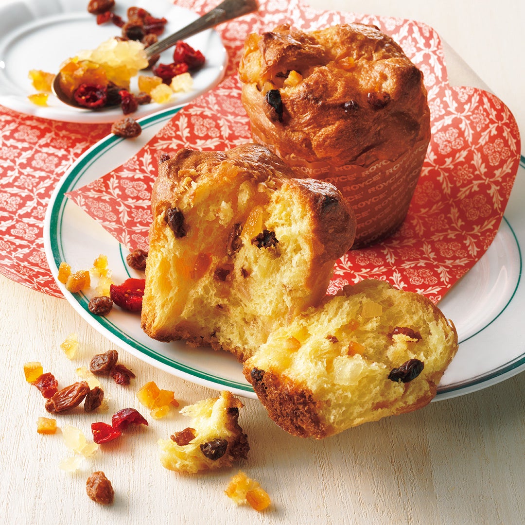 イタリア・ミラノ発祥の伝統的な醗酵菓子「パネットーネ」をロイズのレシピで小ぶりの食べきりサイズに仕上げました。 デュラム小麦粉を使いマンダリンピューレを練り込んだ生地に、糖漬けのオレンジ・レモン・パイナップル、洋酒に漬け込んだクランベリー・レーズンを入れて焼き上げ、オレンジの香る洋酒のシロップを染み込ませました。パネットーネ独特のふんわりしっとりとした食感と芳醇に香る生地、多彩なフルーツの味わいが調和します。