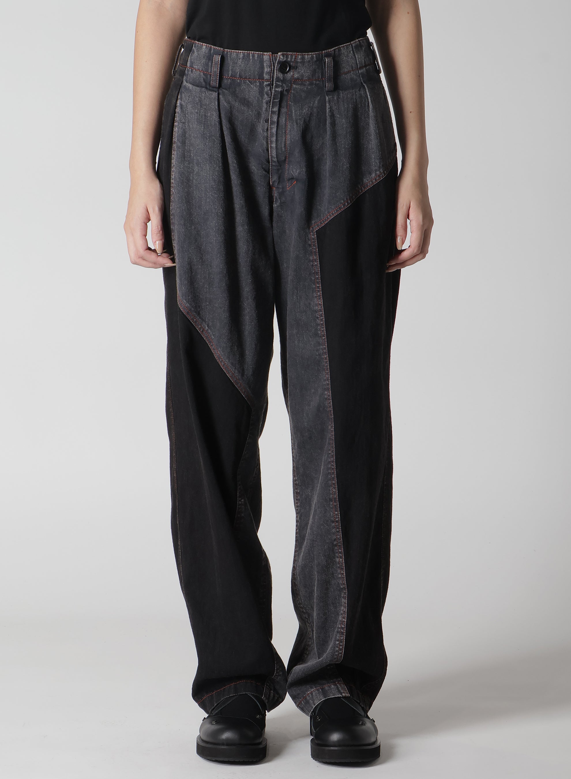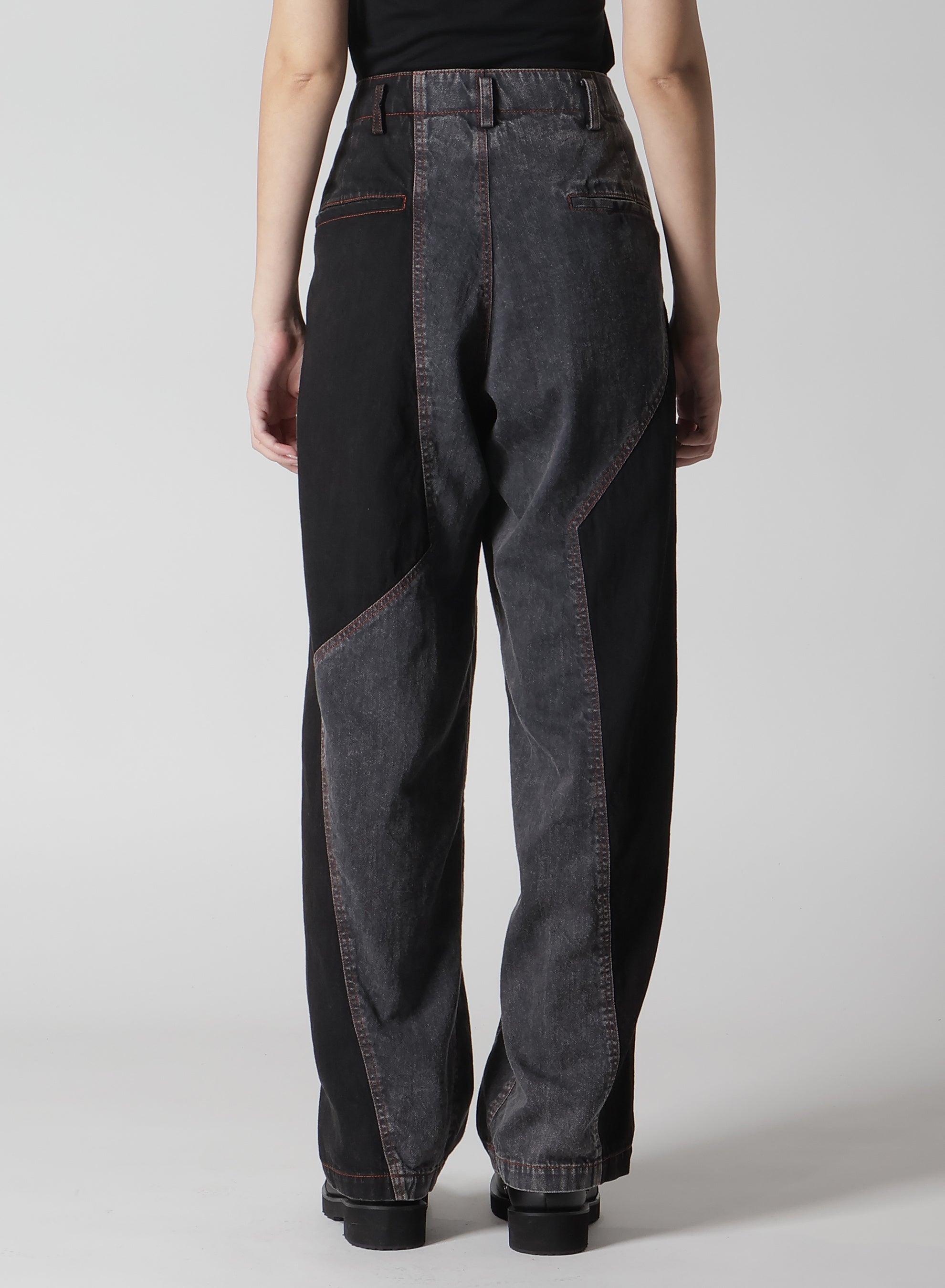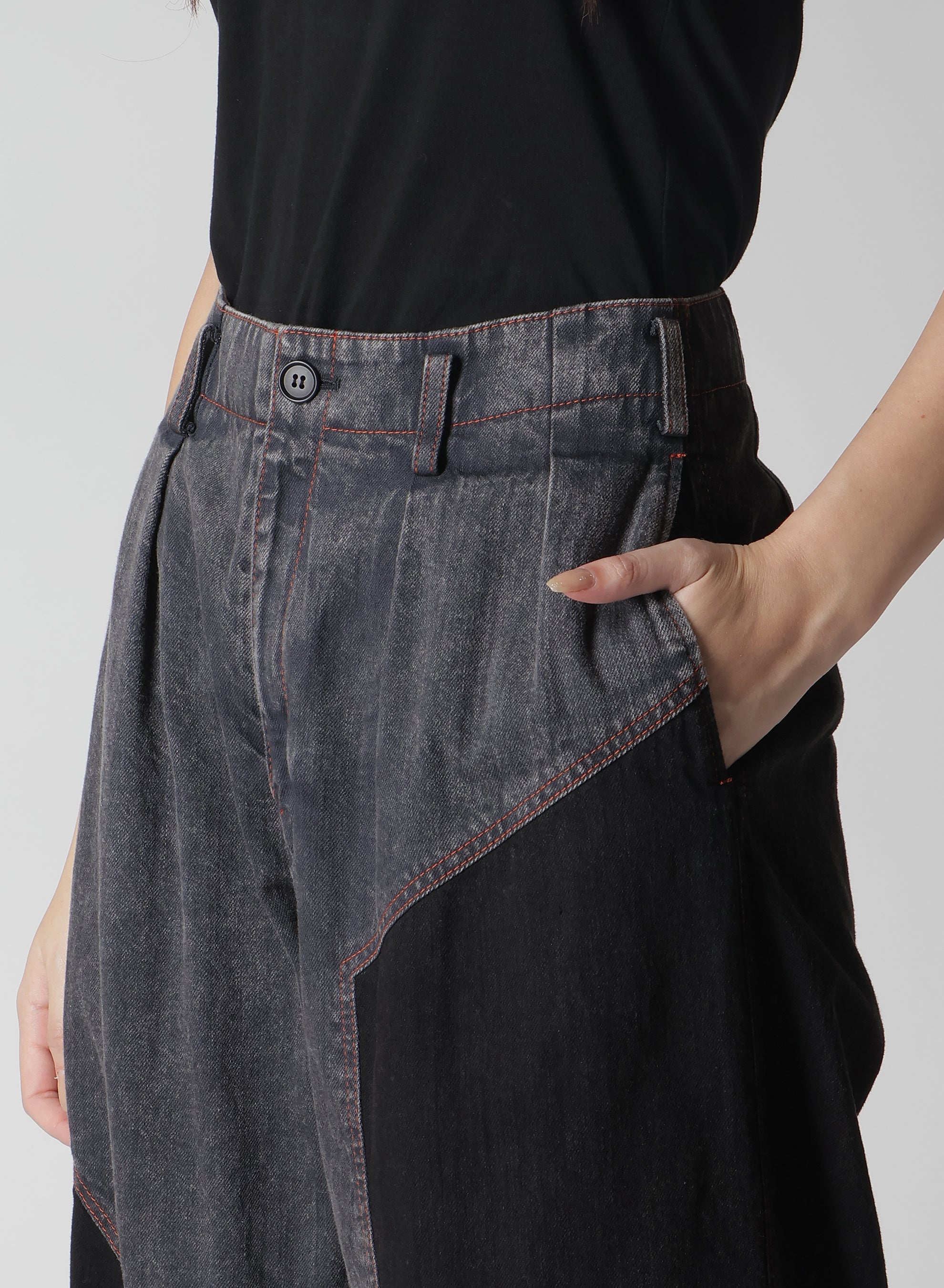 グレーデニムとブラックデニムの組み合わせ、グラフィカルなブラックデニムパーツ、赤ステッチ、後身頃に玉縁ポケット、製品に特殊な脱色加工を施したヴィンテージ感、コットンデニム