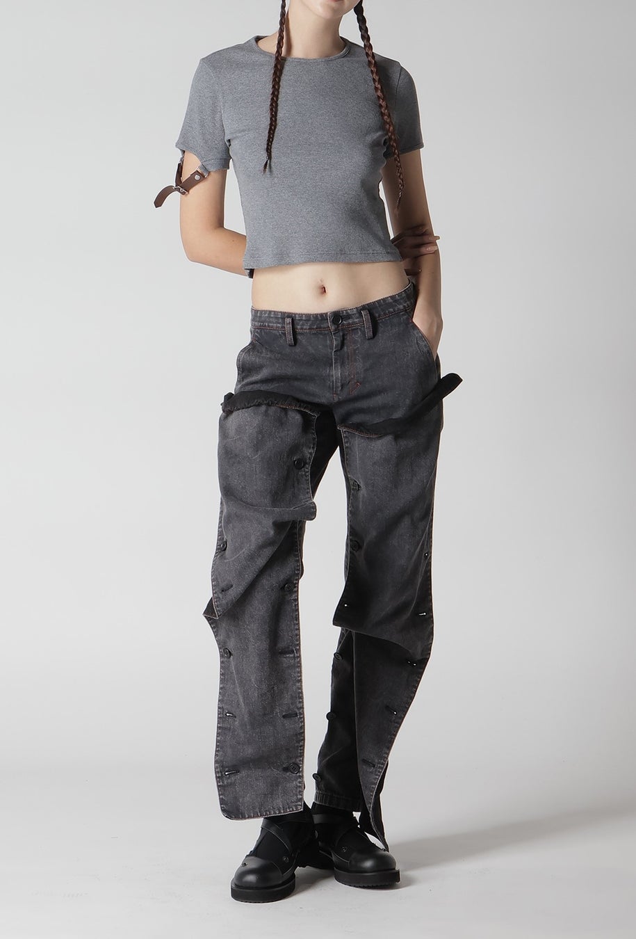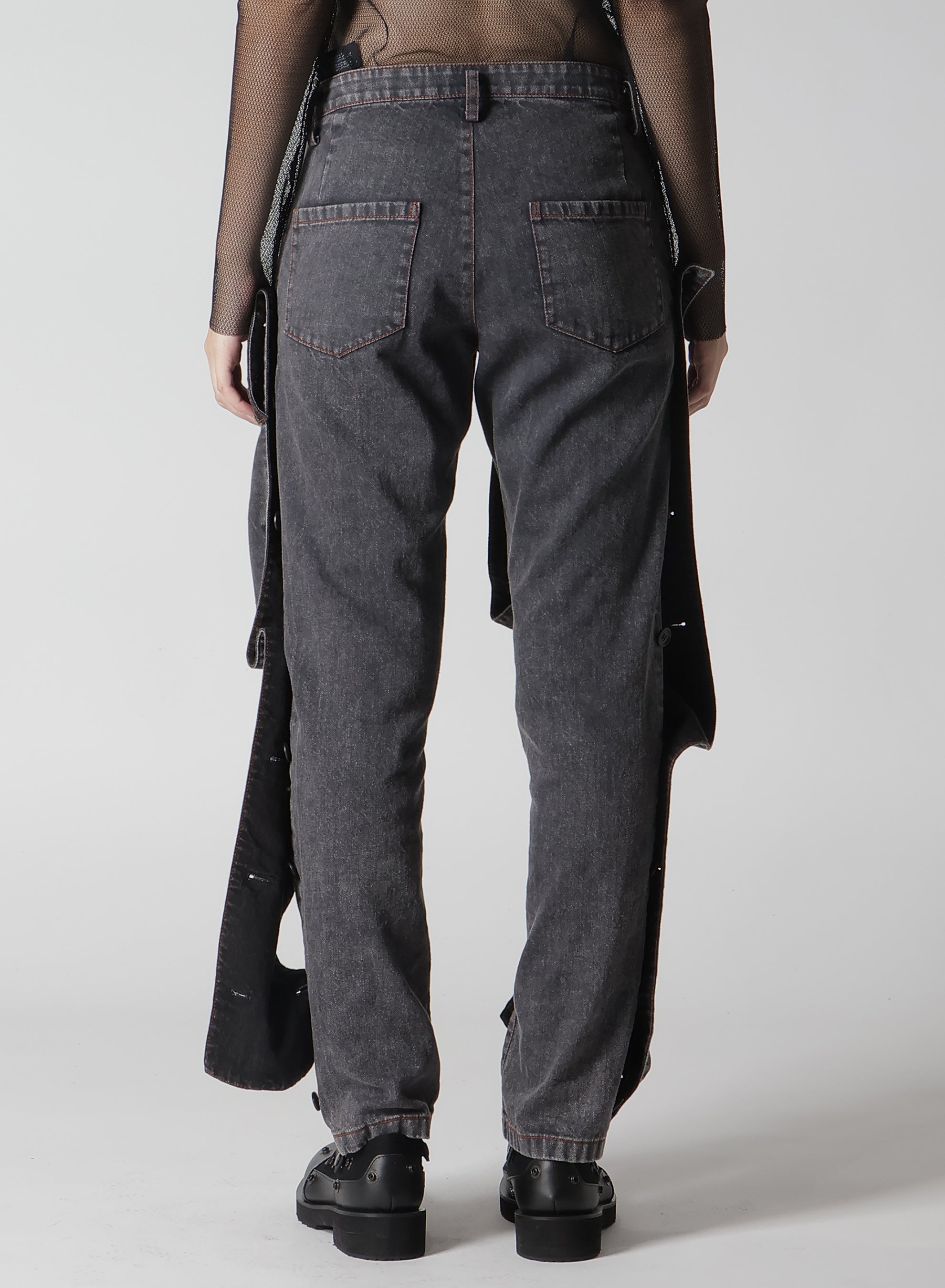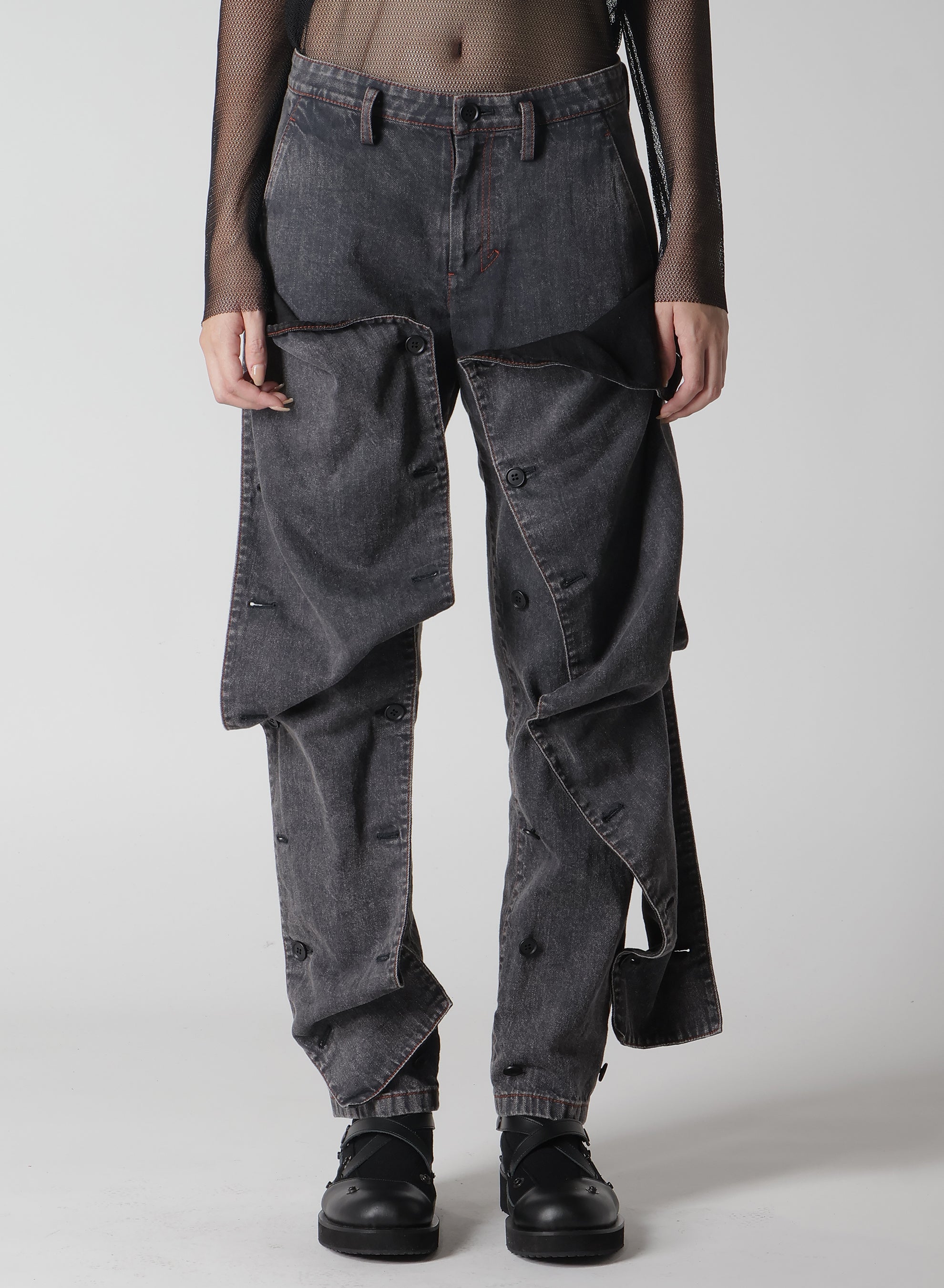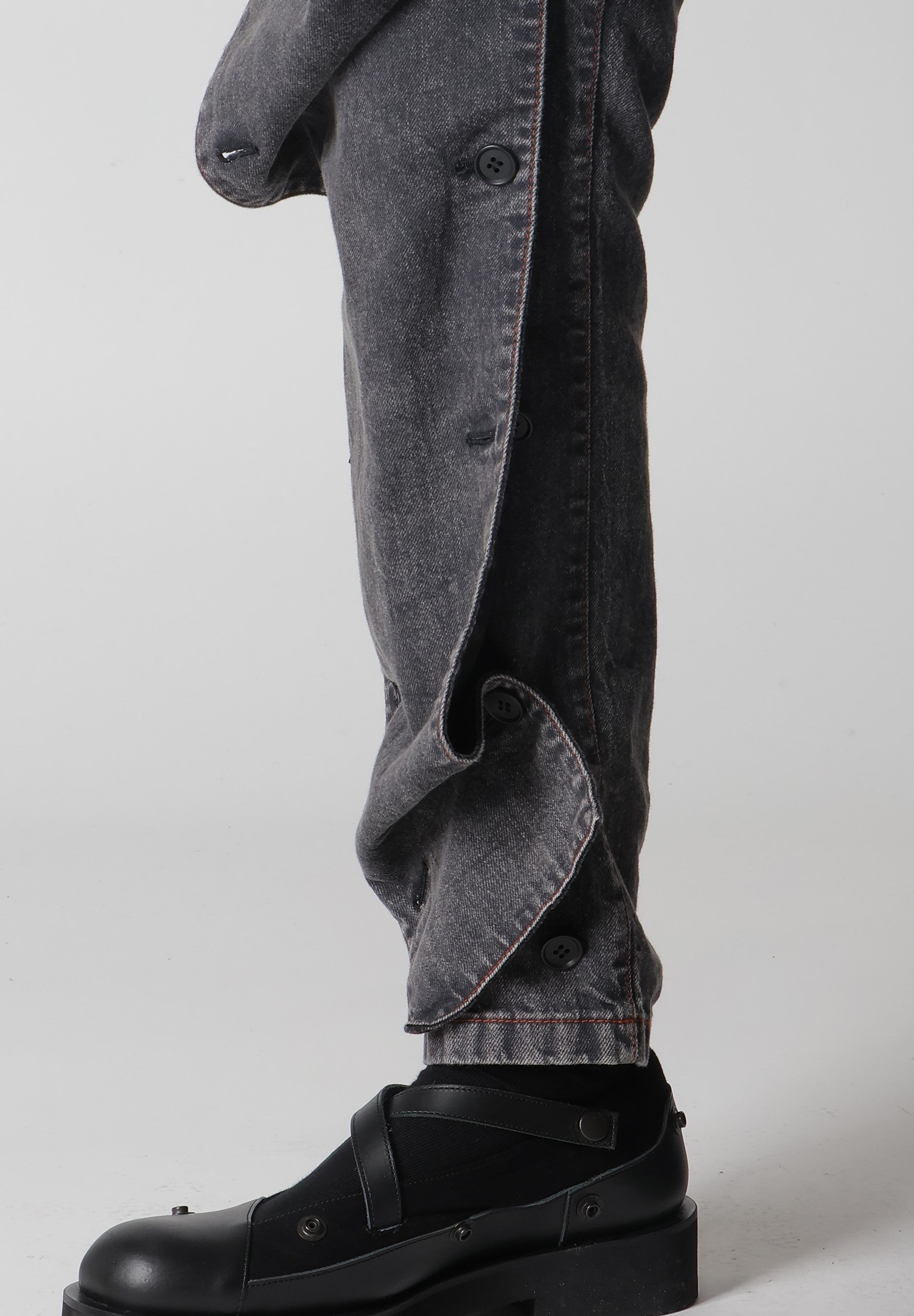 グレーデニムとブラックデニムの組み合わせ、前身頃のデニムカバーのボタンのかけ方によってシルエットが変化、赤ステッチ、後身頃にアウトポケット、製品に特殊な脱色加工を施したヴィンテージ感、コットンデニム