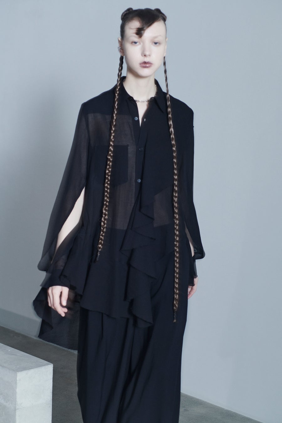 左前身頃からブラウスの前中心にかけて配された大きな曲線を描くフレア、スリーブ内側にスラッシュカット、右胸にアウトポケット、上品な透け感、コットンシルク