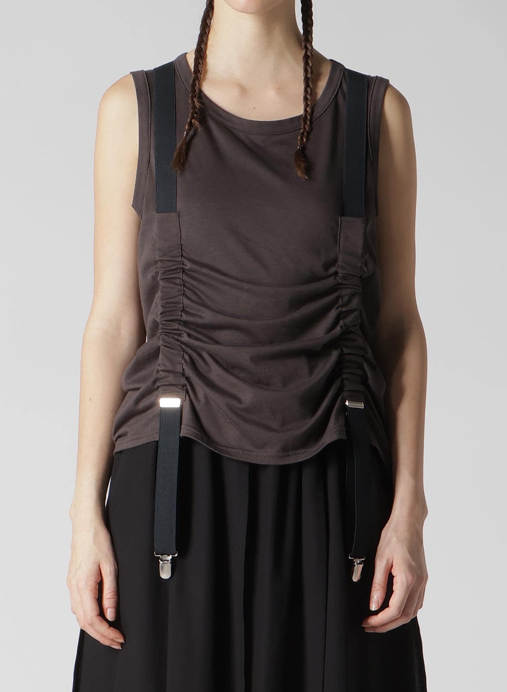 Y型サスペンダーが組み込まれたタンクトップ、クリップエンドタイプ、金具の絞り位置で着丈が変化、セルロースコットン