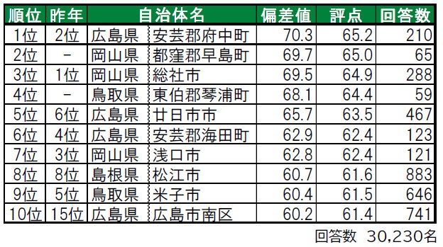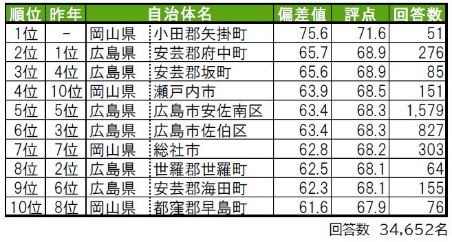 1位は唯一偏差値70台の岡山県小田郡矢掛町で、昨年は累計回答数が50名未満だったためランキング集計対象外だった町です。2位は広島県安芸郡府中町で、「住みここち」「住み続けたい街」「街に愛着がある」1位、「街に誇りがある」2位と各ランキングで高評価を得ている町です。3位は、2位の府中町と同じ広島県安芸郡に属する坂町です。
