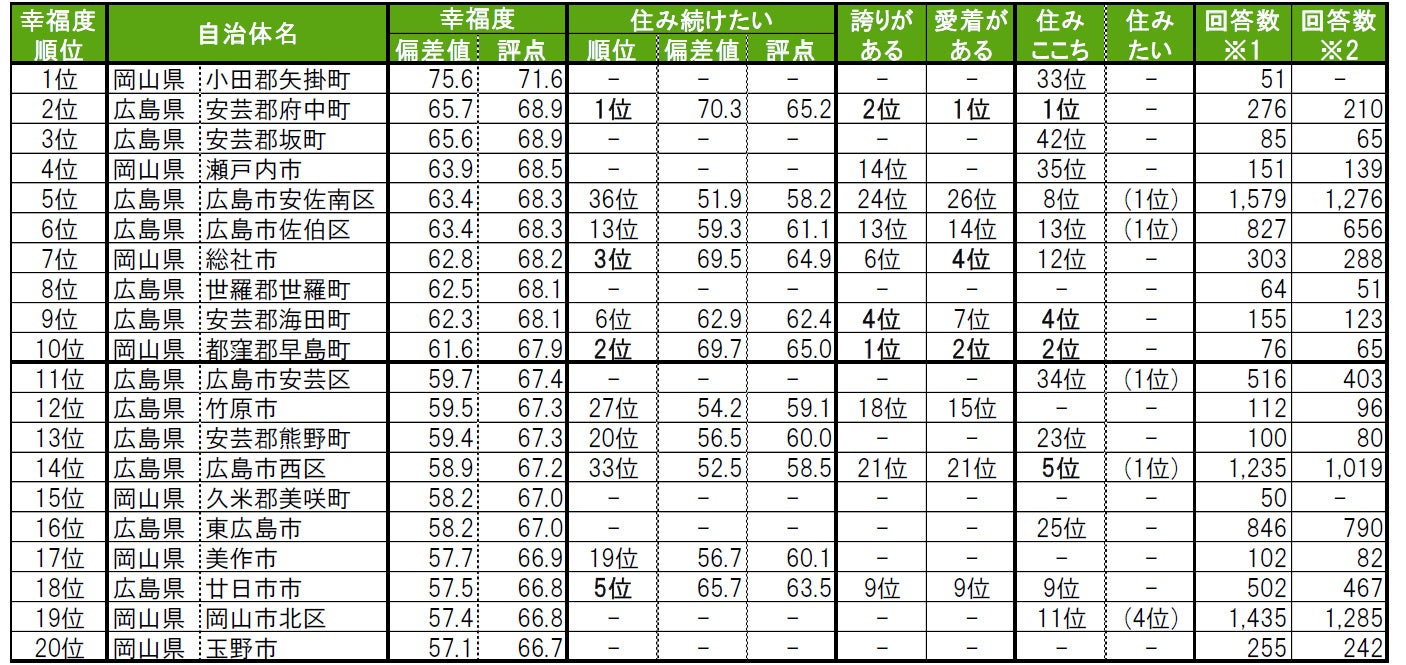 ●トップ20の自治体は、岡山県もしくは広島県の自治体がランクインする結果となっています。