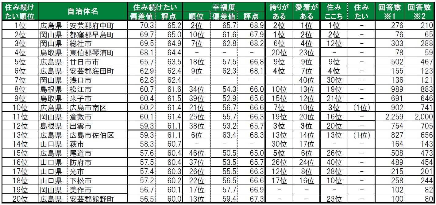 1位は唯一偏差値70台の広島県安芸郡府中町で、「住みここち」「街に愛着がある」1位、「街の幸福度」「街に誇りがある」2位と、各ランキングで高い評価を得ています。2位の岡山県都窪郡早島町は、昨年は累計回答数が50名未満だったためランキング集計対象外だった町で、「街に誇りがある」で1位、「住みここち」「街に愛着がある」は2位となっています。3位は岡山県総社市で、「街に愛着がある」で4位の街です。