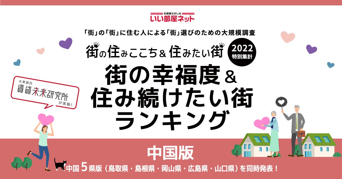 大東建託株式会社(本社:東京都港区、代表取締役社長:小林克満)は、過去最大級の居住満足度調査を行い、「いい部屋ネット 街の幸福度ランキング2022<中国版>」「いい部屋ネット 住み続けたい街ランキング2022<中国版>」として集計しました。