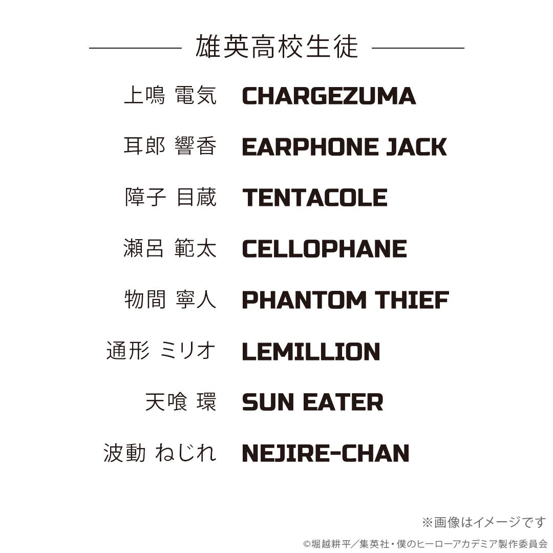 緑谷 出久(DEKU) 爆豪 勝己(GREAT EXPLOSION MURDER GOD DYNAMIGHT) 麗日 お茶子(URAVITY) 飯田 天哉(INGENIUM) 轟 焦凍(SHOTO) 蛙吹 梅雨(FROPPY) 切島 鋭児郎(RED RIOT) 八百万 百(CREATY) 常闇 踏陰(TSUKUYOMI) 上鳴 電気(CHARGEZUMA) 耳郎 響香(EARPHONE JACK) 障子 目蔵(TENTACOLE) 瀬呂 範太(CELLOPHANE) 物間 寧人(PHANTOM THIEF) 通形 ミリオ(LEMILLION) 天喰 環(SUN EATER) 波動 ねじれ(NEJIRE-CHAN) |