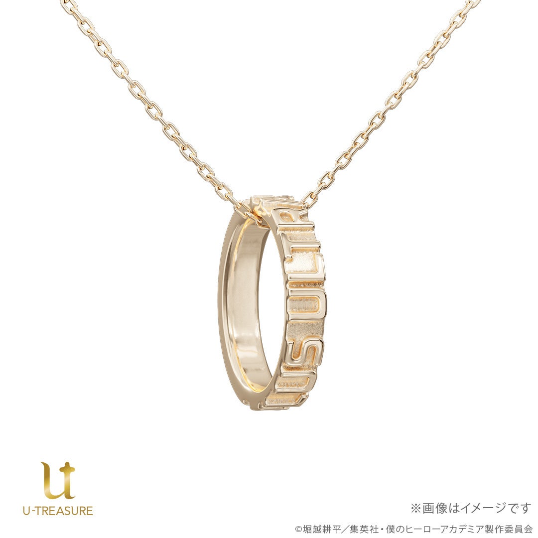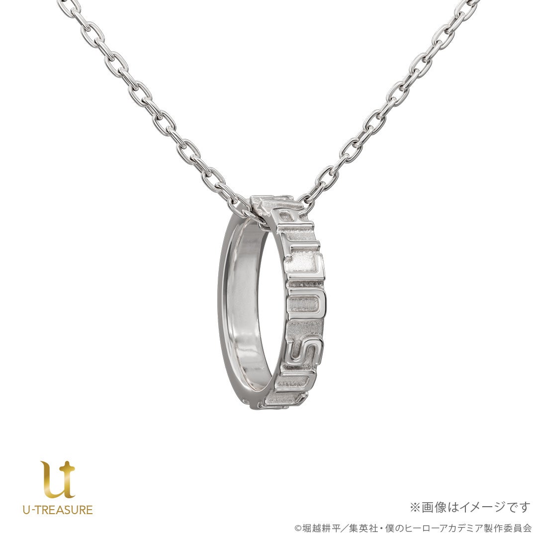 TVアニメ『僕のヒーローアカデミア』リングネックレス。表側には“PLUS ULTRA!”を凹凸でデザイン。内側には雄英高校生徒・プロヒーロー、全27名から選んだキャラクターのヒーロー名を刻印。