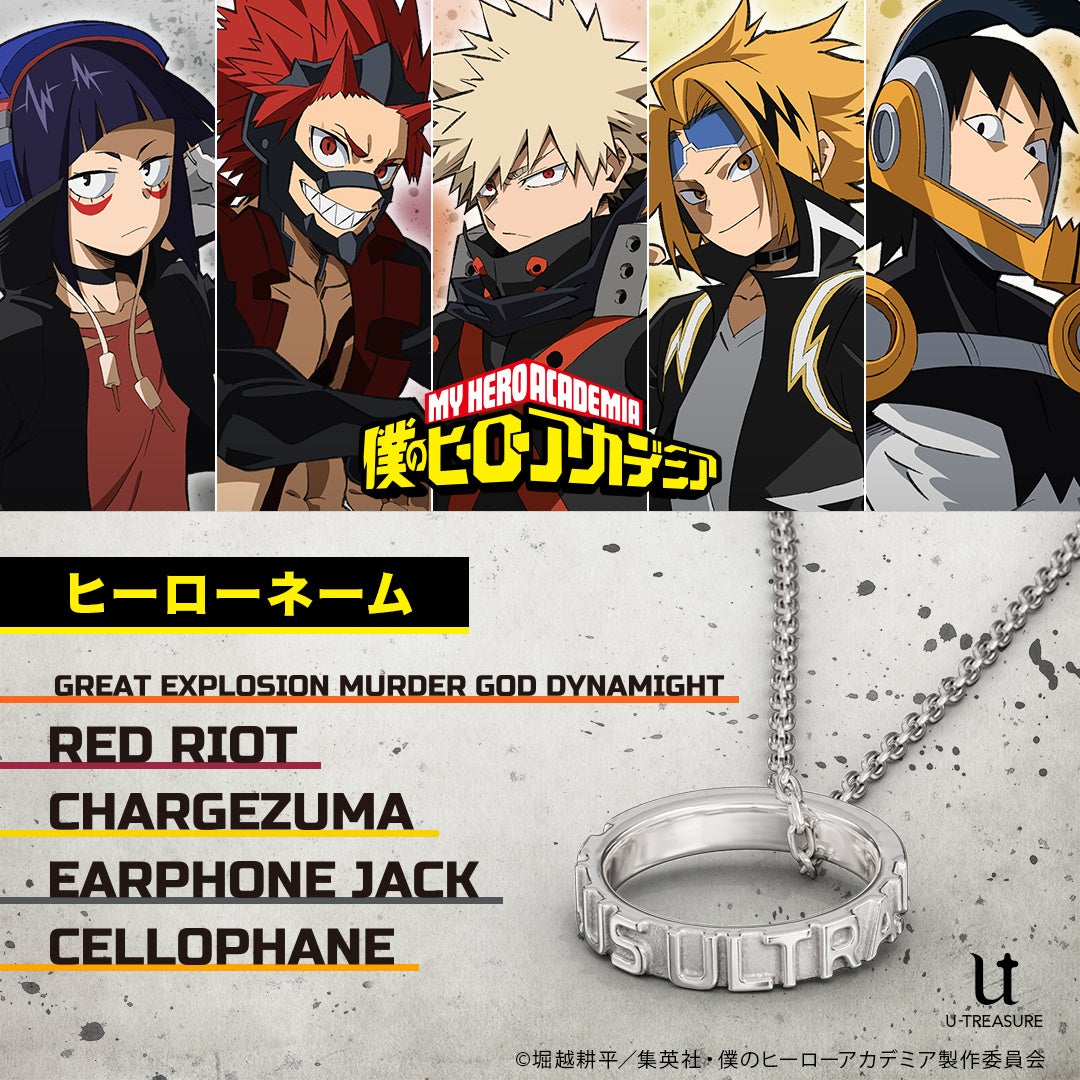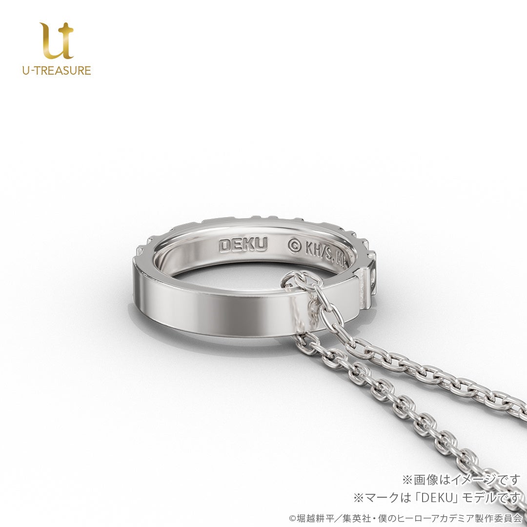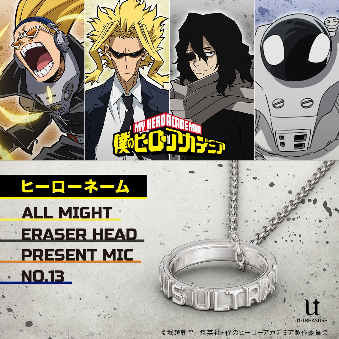 このたびの新作は、TVアニメ『僕のヒーローアカデミア』に登場するヒーローたちをモチーフにしたリングネックレスです。表側には、“PLUS ULTRA!”の文字を凹凸でデザインし、内側には27名の中から選んだキャラクターのヒーロー名を刻印します。