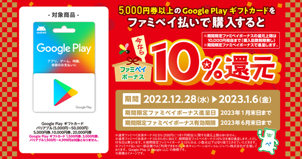 株式会社ファミリーマート(本社:東京都港区、代表取締役社長:細見研介)は、昨年から取組んでいる5つのキーワードの1つである「たのしいおトク」の一環として、5,000円以上の Google Play ギフトカード をファミペイ払いでご購入いただくと購入金額の10%分の期間限定ファミペイボーナスがもらえるキャンペーンを2022年12月28日(水)から2023年1月6日(金)まで全国のファミリーマート約16,500店にて開催いたします。