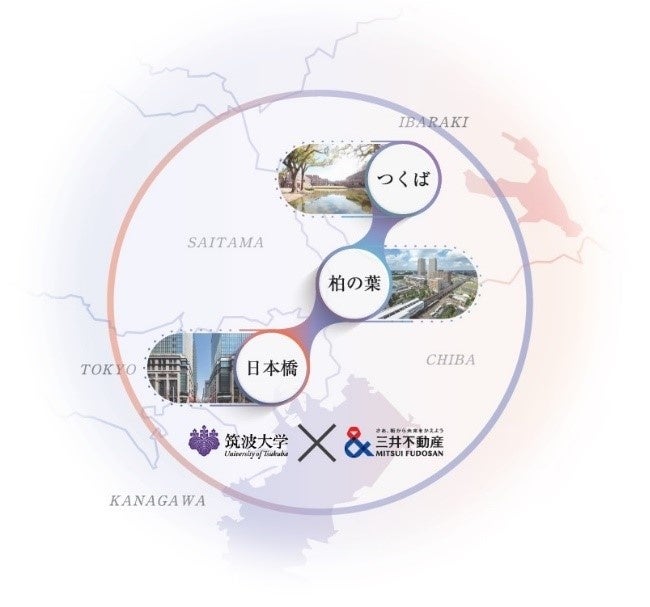 筑波大学があるつくばと、三井不動産が街づくりを推進している柏の葉・日本橋エリアは、つくばエクスプレスや常磐自動車道により緩やかにつながり、教育・研究機関が集まる国内有数の高度人材集積エリアです。