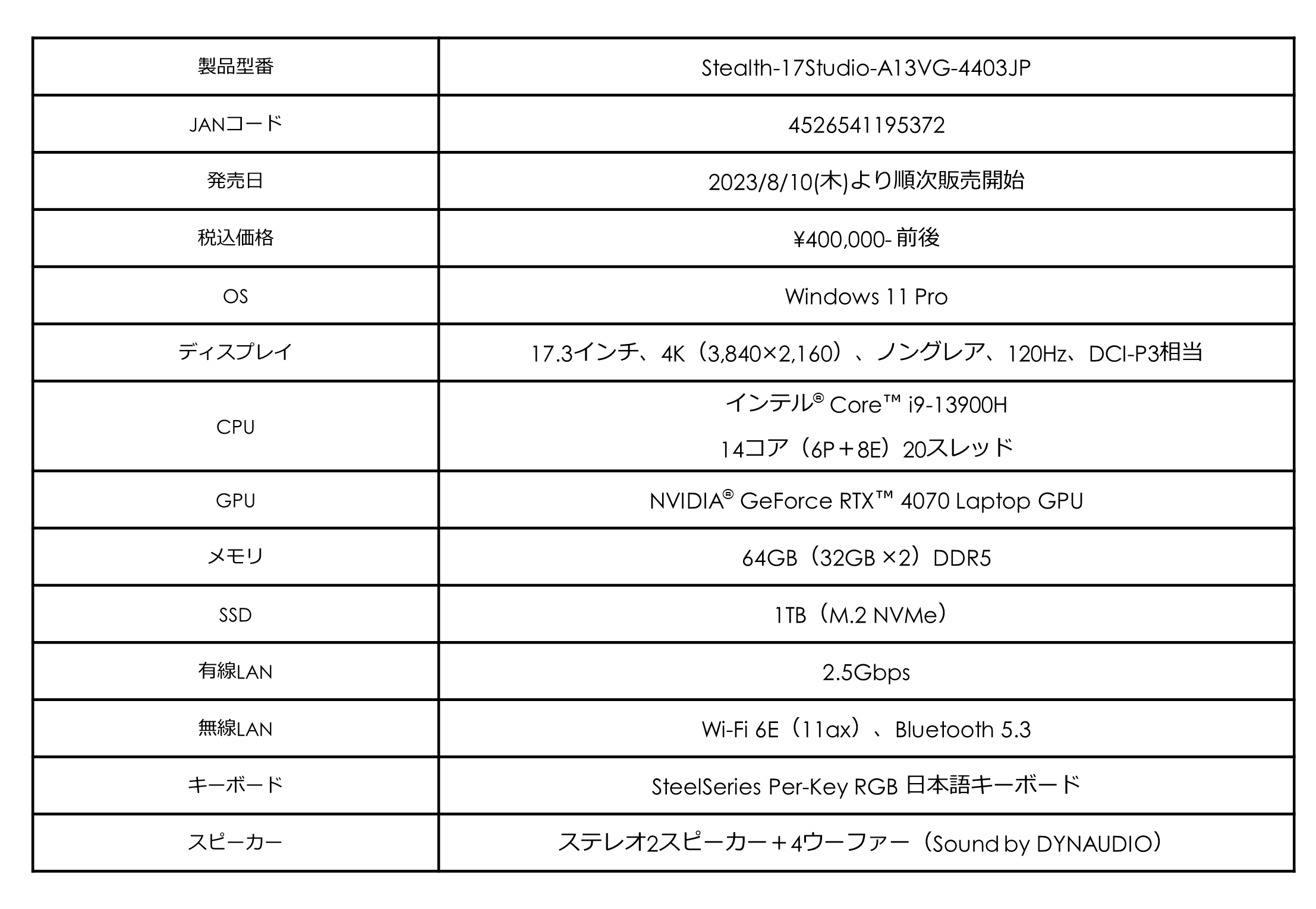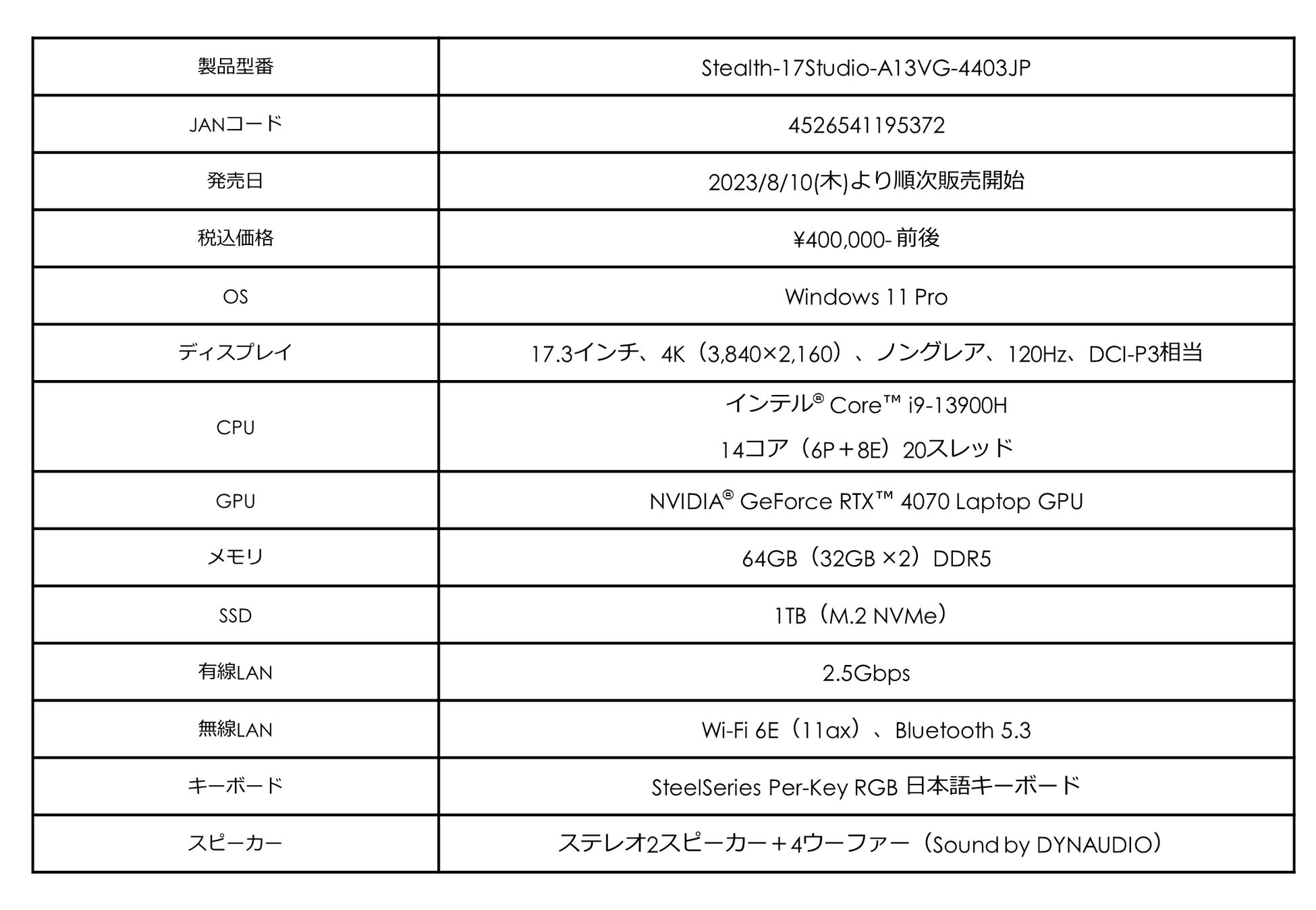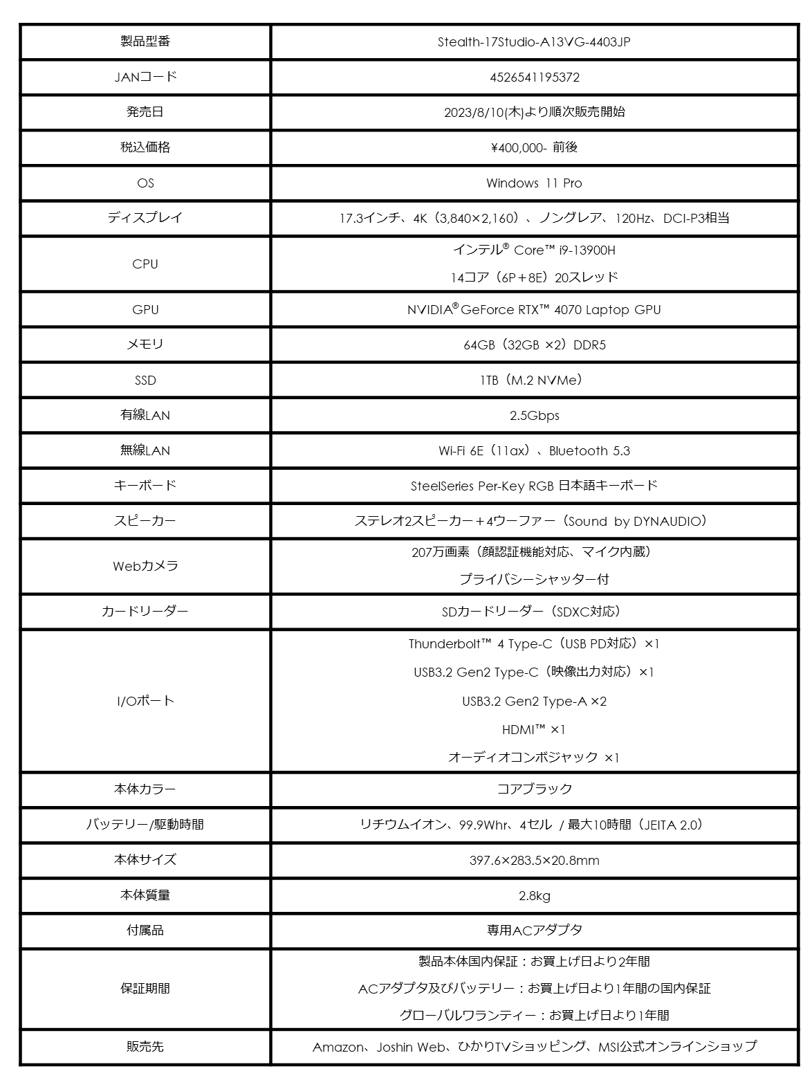 ・Stealth 17 Studio A13V 製品ページ: https://jpstore.msi.com/shopdetail/000000000545/