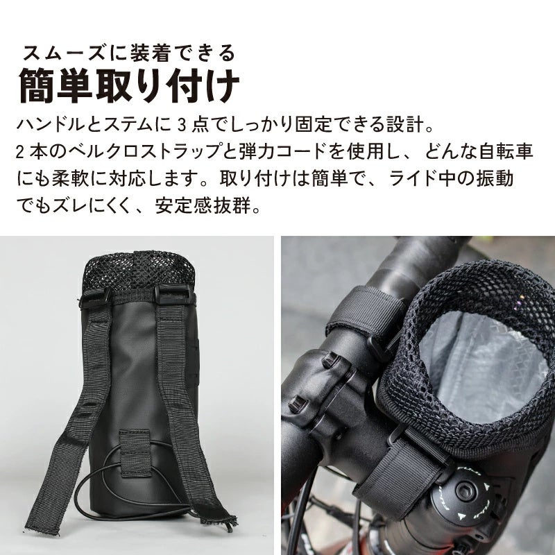 ハンドルとステムに3点でしっかり固定できる設計で、2本のベルクロストラップと