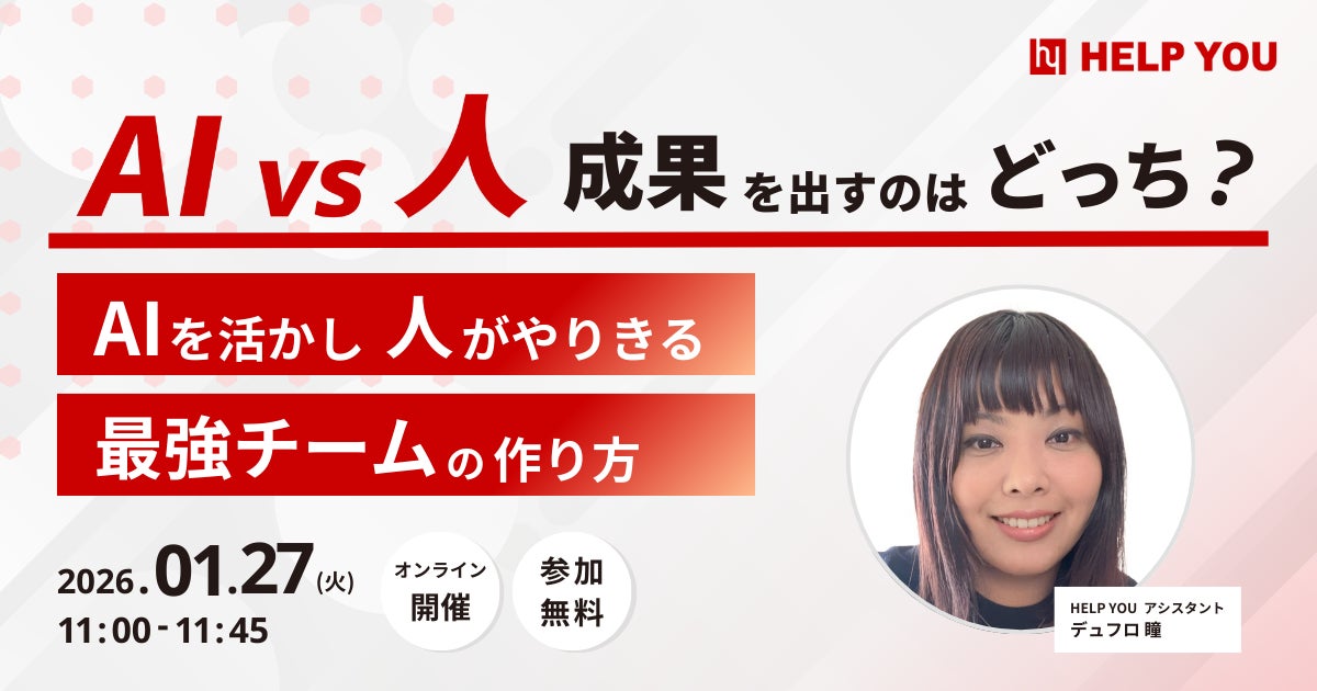 本セミナーでは、AIとHELP YOUで活躍するアシスタントの実務を対比しながら、なぜAIだけでは業務を完璧に進めることが難しいのかを、現場目線で解説。AIが得意な領域と、人が担うべき領域を整理し、AI×人の最適分担によって成果を最大化する「最強チーム」の作り方を、45分でわかりやすくお伝えします。