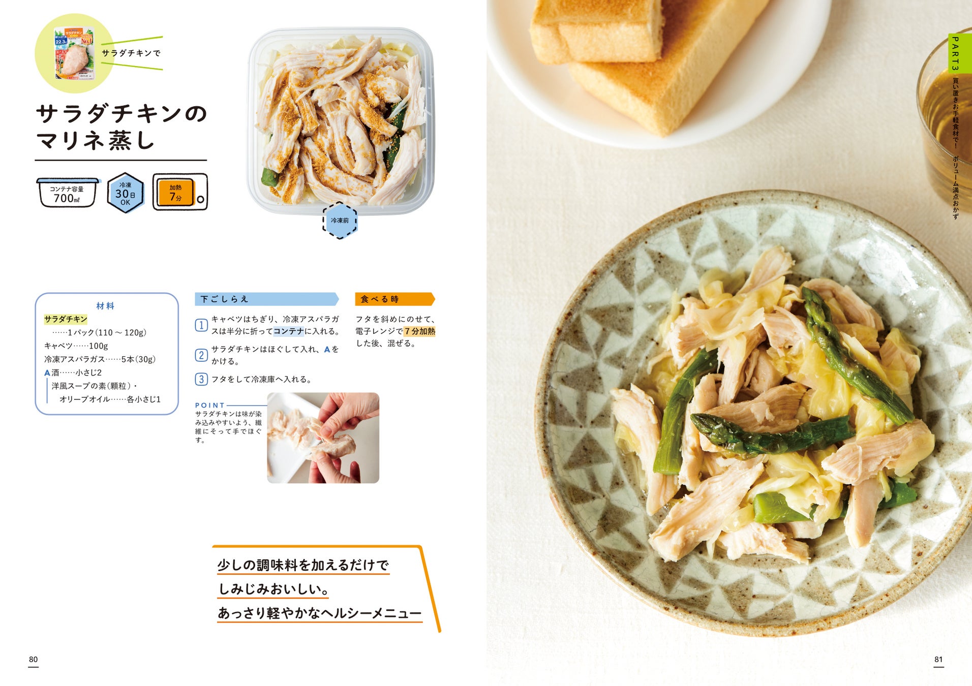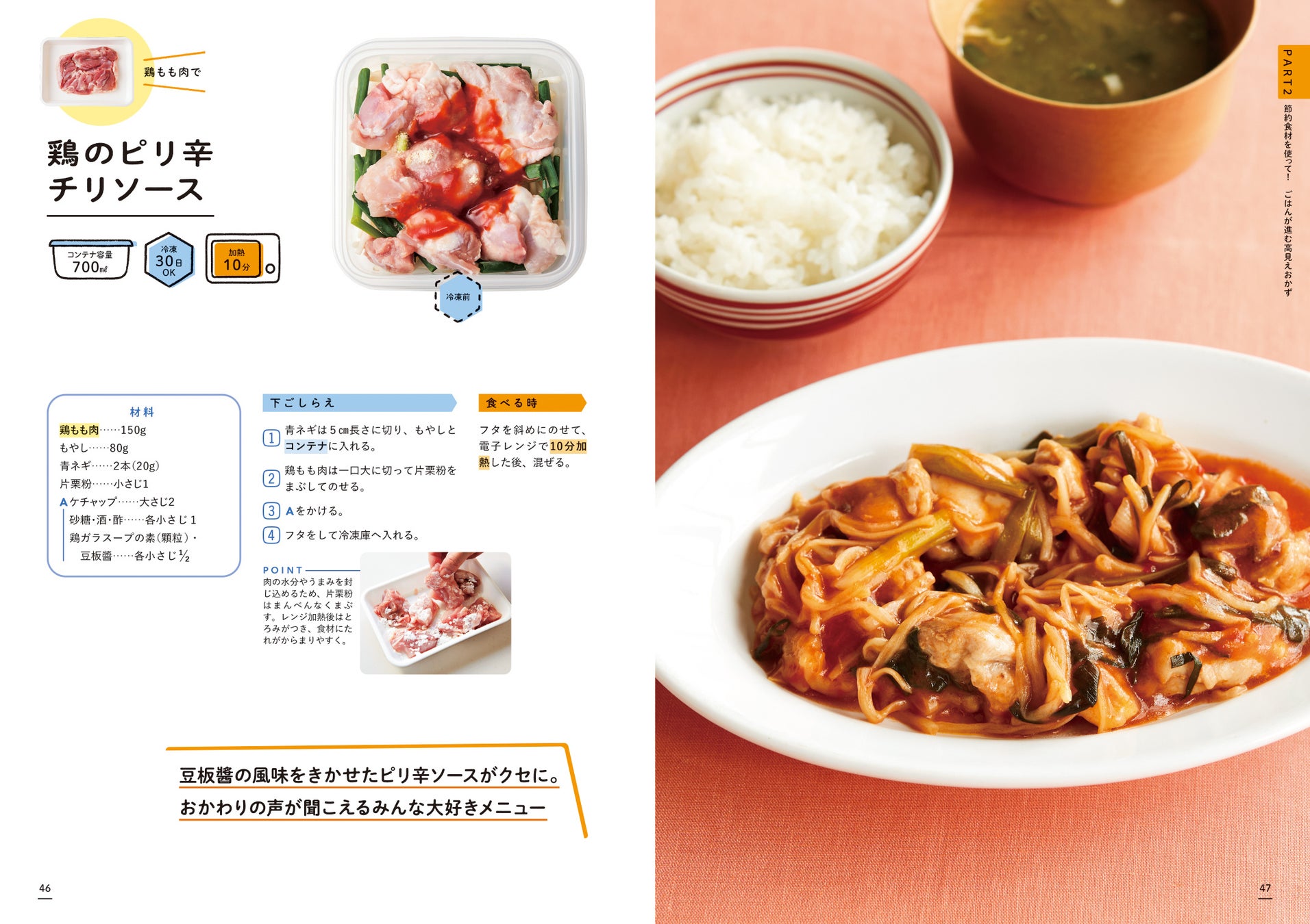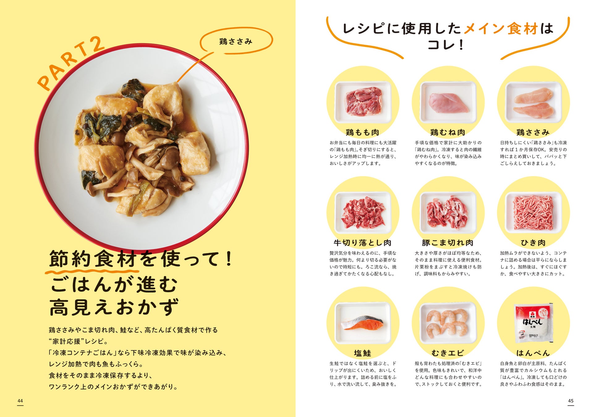 2章では節約食材を使って、ごはんがすすむ高見えおかずレシピを紹介。鶏ささみや豚こま切れ肉などの高たんぱく質食材で作る”家計応援”レシピです。「冷凍コンテナごはん」なら下味冷凍効果で味がしみ込み、レンジ加熱で肉も魚もふっくら。食材をそのまま冷凍保存するより、ワンランク上のメインおかずができあがります。