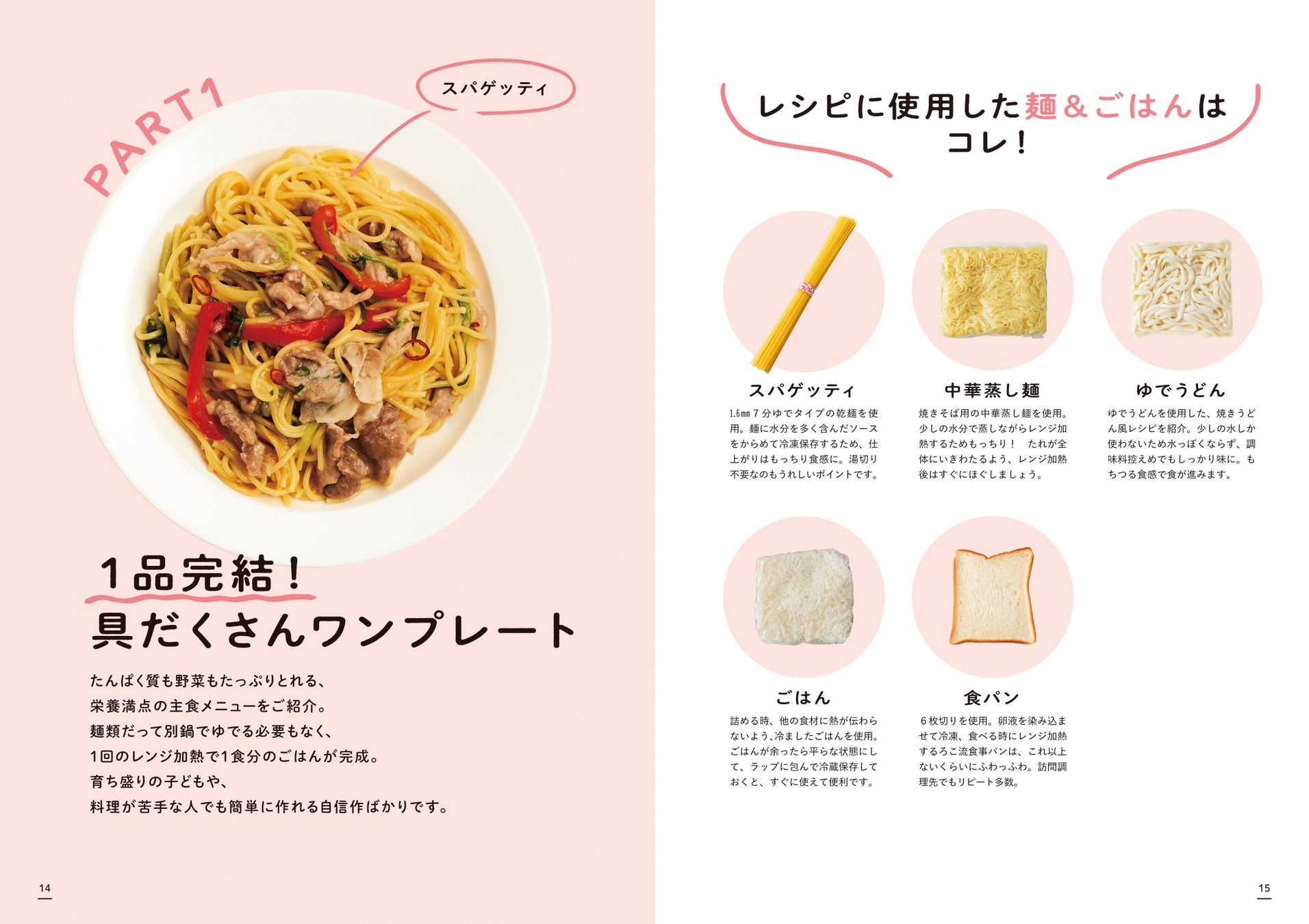1章ではたんぱく質も野菜もたっぷりとれる、栄養満点の具沢山なワンプレート主食メニューを紹介します。仕事帰りでヘトヘト、家事育児が大変といったときにもこの一品があれば安心です。麺類だって別の鍋で茹でる必要がなく、1回のレンジ加熱で1食分のごはんがすぐに完成。ごはんやパンのメニューもあるので、朝昼晩どんなシーンでもぴったりなレシピばかり。育ち盛りの子どもや、料理が苦手な人でも簡単に作れる自信作を揃えました。