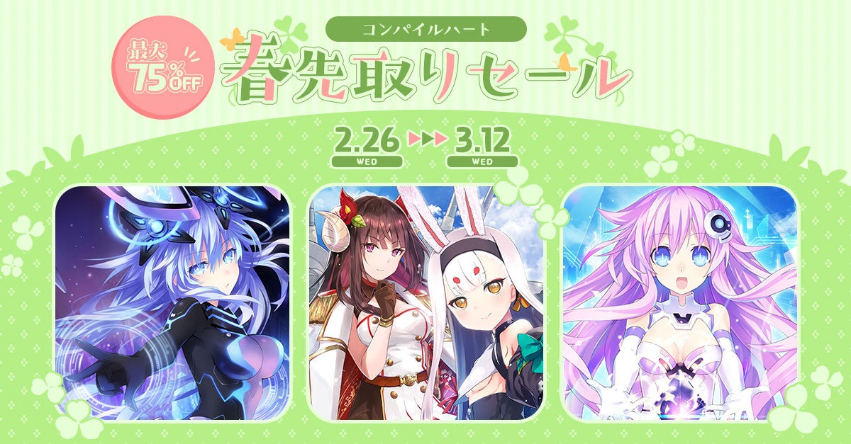 アイディアファクトリー株式会社(代表取締役社長:佐藤 嘉晃/所在地:東京都豊島区)の子会社である株式会社コンパイルハート(取締役社長:冨長 直人/所在地:東京都豊島区)は、本日2月26日(水)よりニンテンドーeショップおよびPlayStation®Storeにて《コンパイルハート春先取りセール》を開始いたしました。