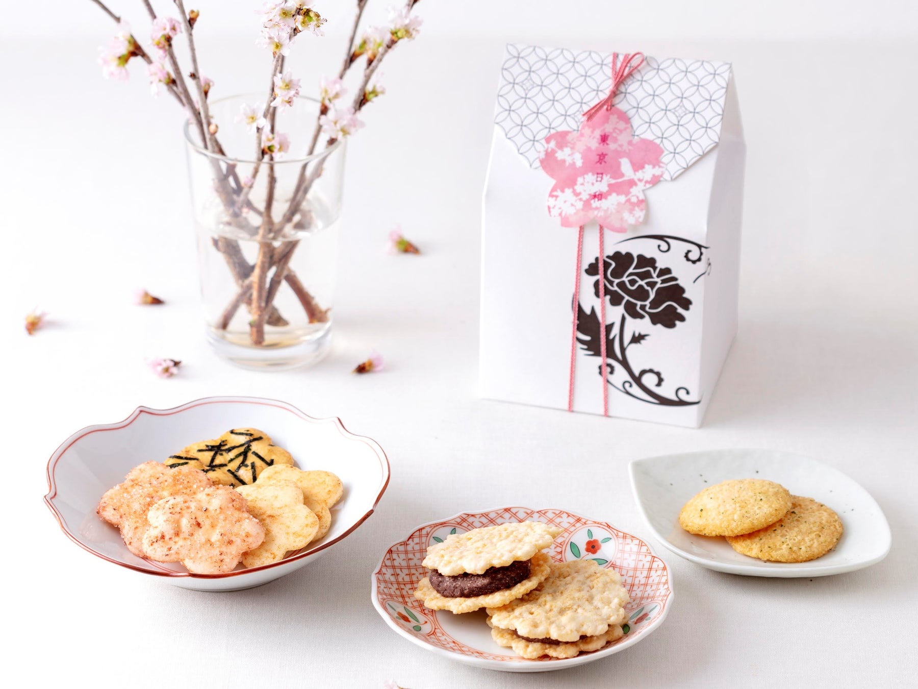 塩味の米粒煎餅にあんこを挟んだ甘じょっぱい味が人気のあんこ天米と、季節のおすすめ・コンソメ煎餅など5種類をセットにしました。