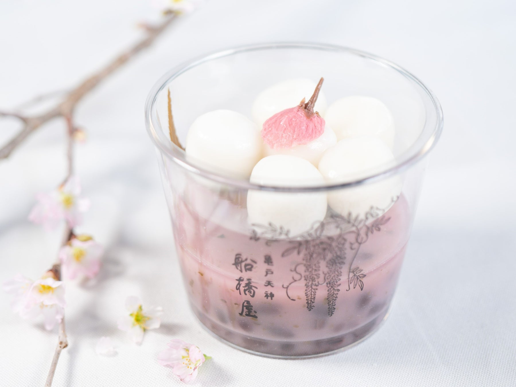 香り豊かな桜あんを使用してお作りした春の限定商品。船橋屋特製の小豆と桜あんのおしるこに、白玉をからめてお召し上がりください。※エキュート日暮里も取り扱いあり(3/4~3/31)