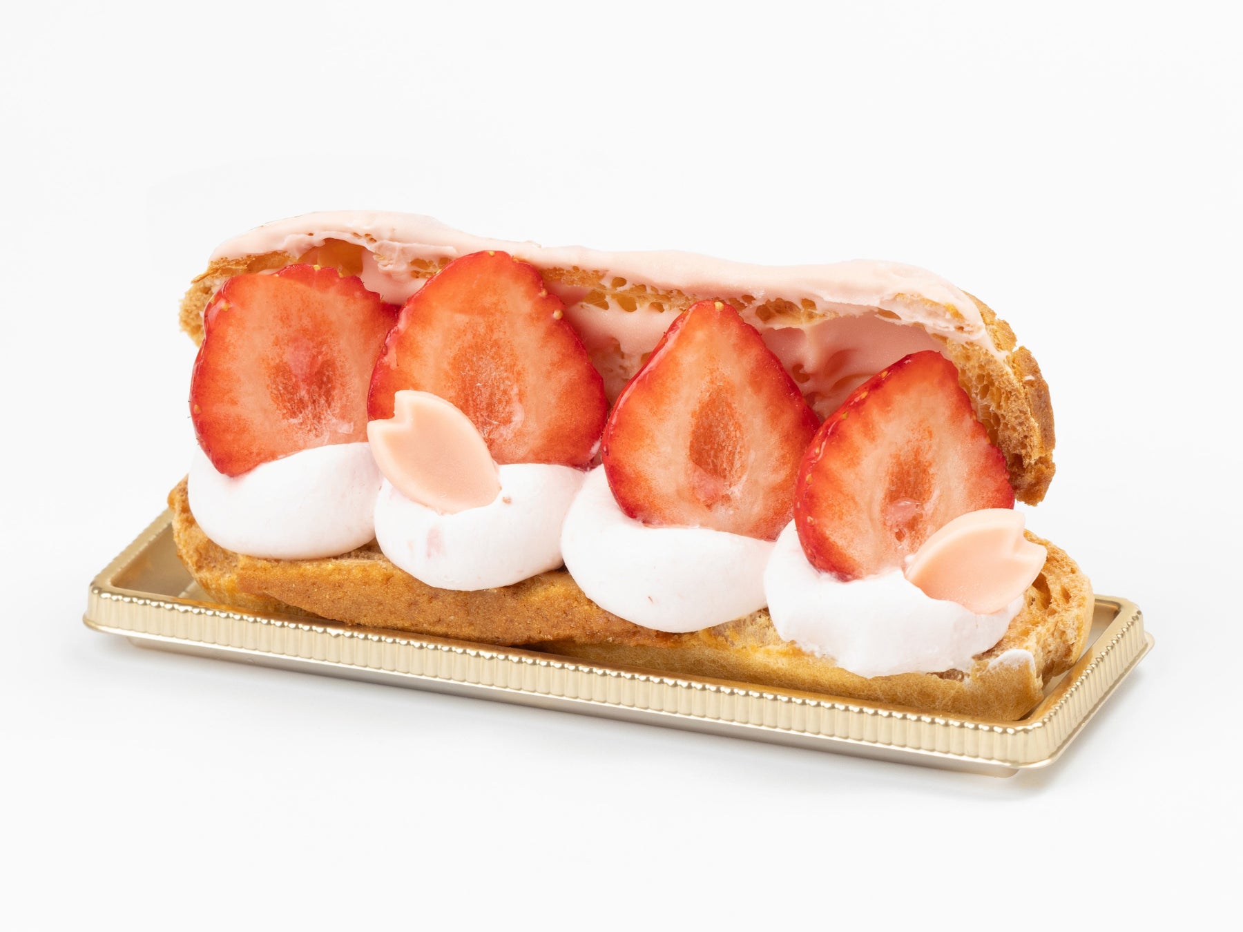 あまおういちごに、春をイメージしたいちごクリームとさくらの花びらチョコレートを合わせた華やかな一品。食感にこだわったエクレール生地と、まろやかなカスタードクリーム・特製いちごピューレを混ぜ込んだいちごクリーム、あまおうのおいしさをワンハンドで楽しめます。