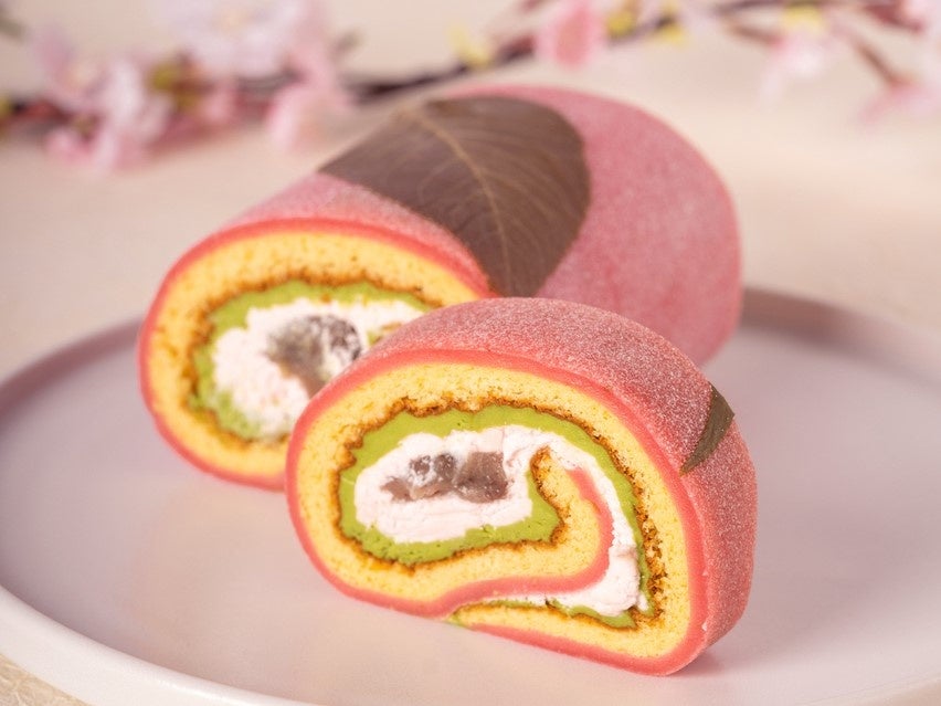小麦粉不使用の米粉生地で、抹茶カスタード、桜の生クリーム、北海道小豆と桜餅あんをたっぷり巻き込み、桜シロップと苺パウダー入りの求肥でくるりと包みました。カラーリングもかわいらしい季節限定のもちもち食感ロールケーキです。