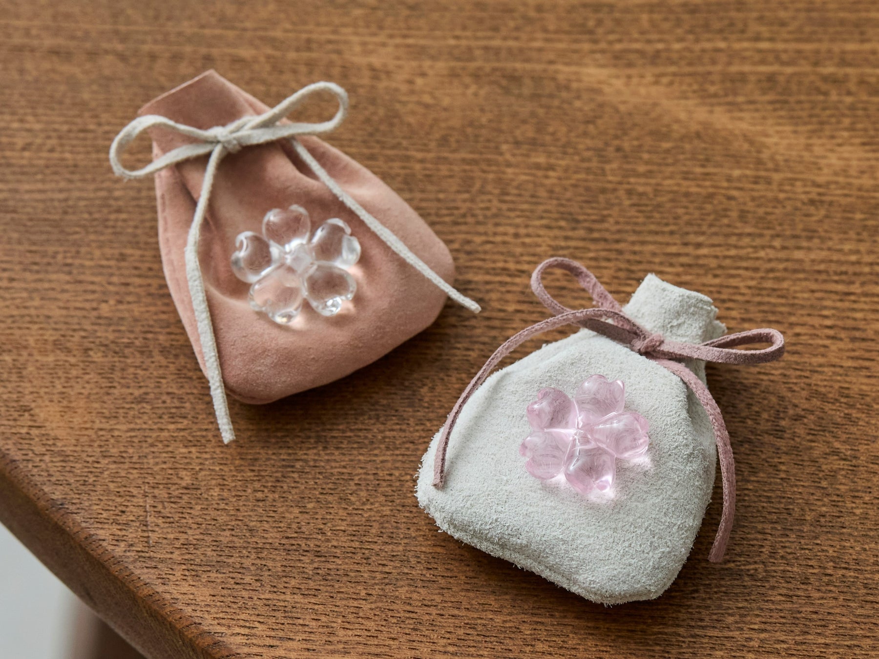 小さなガラスの桜と巾着袋のセット。花咲かせたい願いを込めた愛らしいお守りは、願いをこめながら袋に入れていただくことで、自分だけの特別な思いが宿るお守りに。ガラスの桜はバーナーの炎でガラス棒を溶かす、バーナーワークという技法で成形しています。