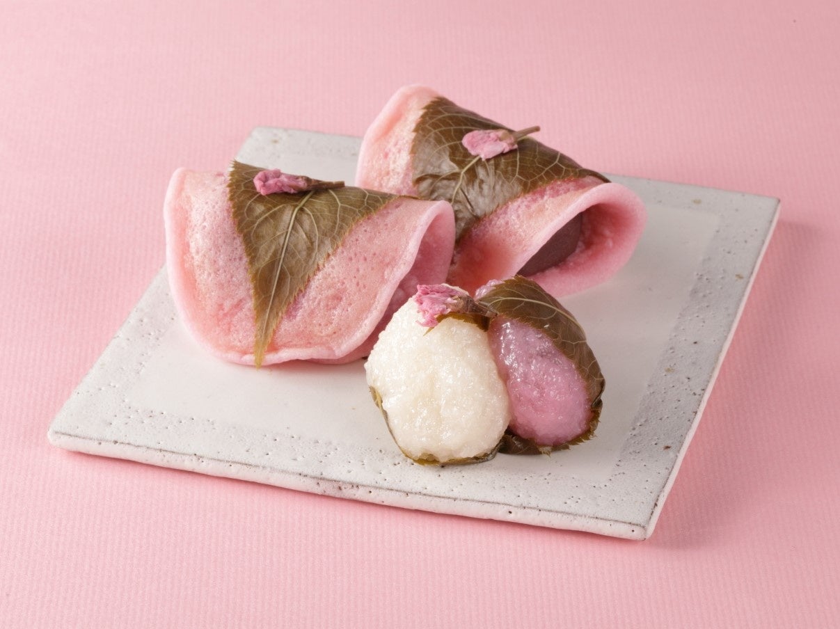奥は、焼皮で口どけの良いこしあんを包んださくらもち。手前は、赤はこしあん・白は白あんの2種のお味をお楽しみいただけるかわいらしい紅白道明寺です。焼いた生地であんを巻く「関東風」と、餅米であんを包んだ「関西風」の両方をご用意しています。